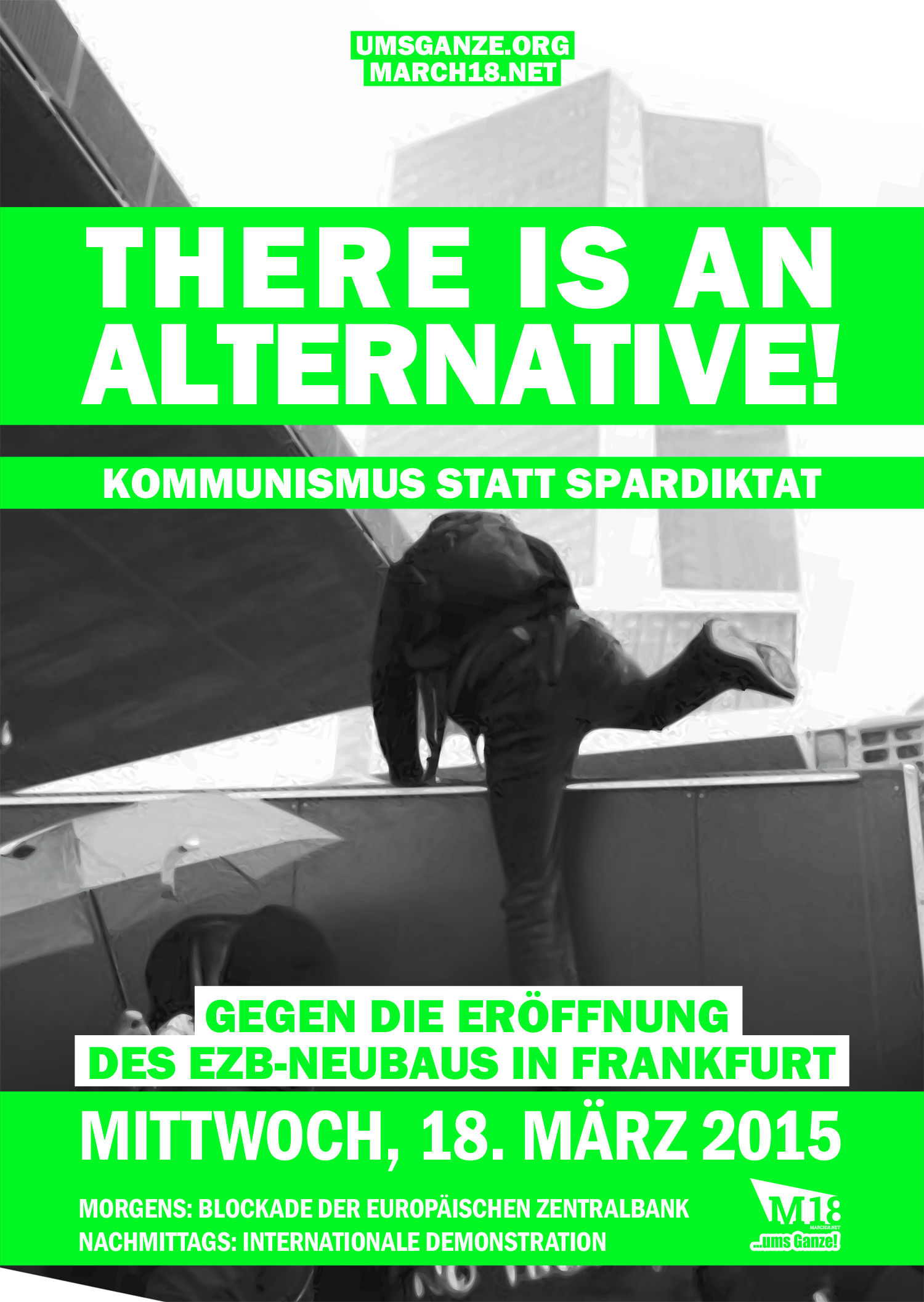 Keine neue Einsicht: Das gute Leben wird erst anbrechen, wenn wir es selbst in die Hand nehmen. Am 18. März feiern die Herrschenden Europas aber nicht nur die Einweihung eines Gebäudes und ein besonders hässliches Beispiel für Herrschaftsarchitektur. Sie setzen sich als fleißige Verwalter in Szene und feiern eine Ordnung von Ausbeutung und Zurichtung, von Hunger und Elend. Mit der EZB-Eröffnung inszeniert sich das Schweinesystem immer noch als unangreifbar, alternativlos und sympathisch. Wenn sie auf die Normalisierung der Krisenverwaltung anstoßen, sollten wir ihnen zeigen, dass unsere Krise noch lange nicht zu Ende ist und ihre erst begonnen hat. Gegen die vermeintliche Alternativlosigkeit der neoliberalen Tristesse wie gegen ihre autoritäre Formierung im Namen von Kultur und Religion stellen wir unsere Solidarität mit den emanzipatorischen Kämpfen Europas und darüber hinaus. Die Zeit, um der Zukunft im Heute zu ihrem Recht zu verhelfen, ist so gut, wie seit langem nicht mehr – aber die Gefahr, diese Chance zu verpassen, ebenso. Wir werden daher an diesem Tag, dem Tag, der bis auf weiteres nur zufälligerweise auch der Jahrestag der Pariser Kommune ist, zeigen, dass sich der Traum einer anderen Welt bereits auf den Straßen und Plätzen versammelt. Denn: Kein Applaus für Scheiße. Kapitalismus tötet. Aber eben nur solange, bis wir ihn überwinden. Es ist an uns. All die Kämpfe, die wir führen – antifaschistische Abwehrpolitik, praktischer Antirassismus und Feminismus, die Auseinandersetzungen um Bildung und Arbeit, all die nächtlichen Aktionen voller Wut und Hoffnung sind richtig und wichtig. Aber wir gehen am 18. März auf die Straße, weil diese Kämpfe aussichtslos sind, wenn nicht allen klar ist, dass sie miteinander zusammenhängen. Kein Witz: Eine andere, eine solidarische Welt ist möglich – aber sie kann nur auf den Trümmern der alten Ordnung errichtet werden. Fangen wir mit dem Abriss an.