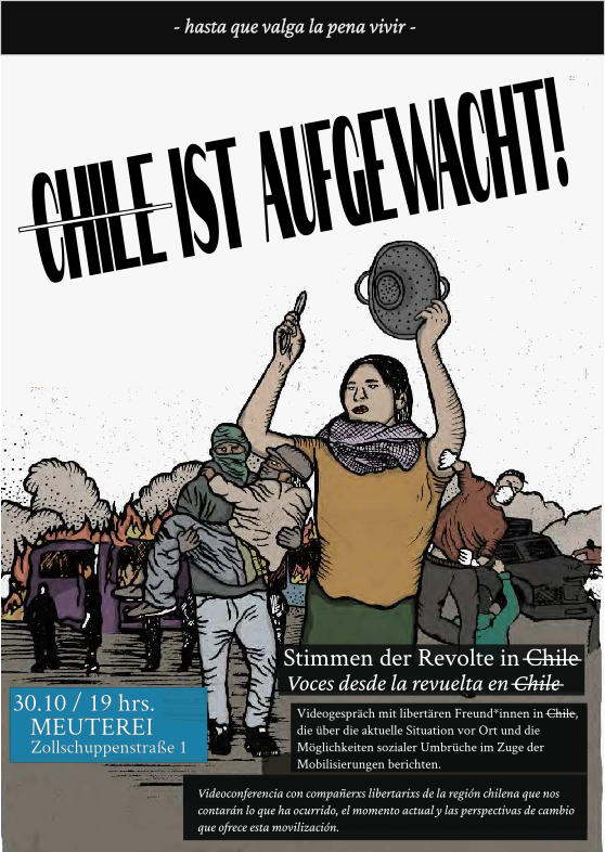 Videogespräch mit libertären Freund*innen in Chile, die über die aktuelle Situation vor Ort und die Möglichkeiten sozialer Umbrüche im Zuge der Mobilisierungen berichten.