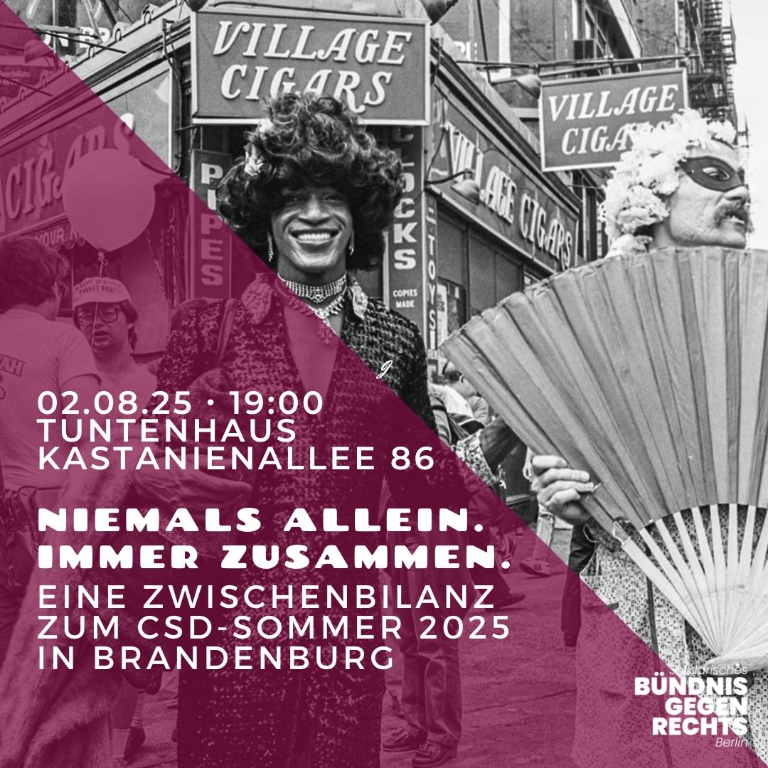 Im zweiten Teil der Veranstaltung richten wir den Blick nach vorn: Weitere CSDs stehen bevor – darunter in Städten, in denen rechte Mobilisierungen zuletzt zugenommen haben. Außerdem gibt es aktuelle Infos zur gemeinsamen Anreise nach Ludwigsfelde, Rathenow, Bautzen und Co.