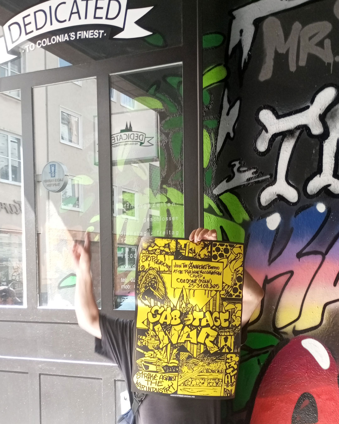 Jetzt erst recht: kommt alle nach Köln! Während die Kölner Bullen mit einem Verbot des antimilitaristischen Camps Ende August in Köln drohen, sind bei zahlreichen linken, alternativen und anarchistischen Projekten und am Rheinufer quer durch ganz Köln Plakate mit dem Slogan „Sabotage War“ (deutsch: Den Krieg sabotieren) aufgehängt worden. Angesichts der Verbotsdrohung der Bullen nimmt die Mobilisierung zum Rheinmetall entwaffnen Camp vom 25. bis 31. August 2025 in Köln nun richtig Fahrt auf.
