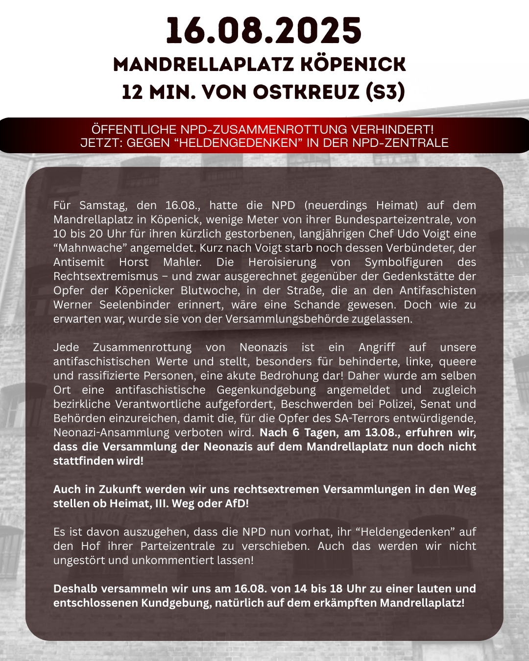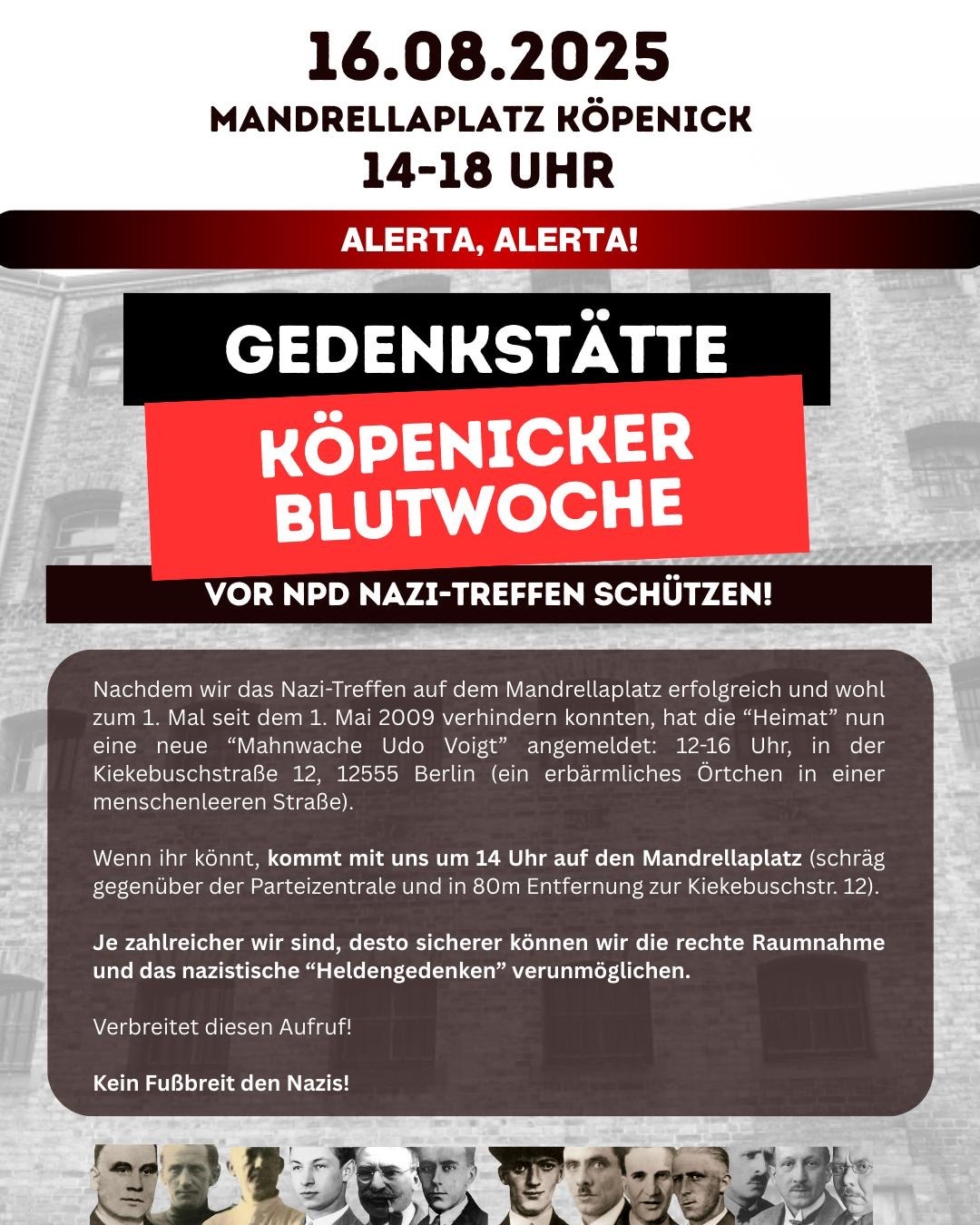 Aufruf: Samstag 14 Uhr nach Köpenick gegen Heldenkult-Veranstaltung der Nazis von NPD/Heimat