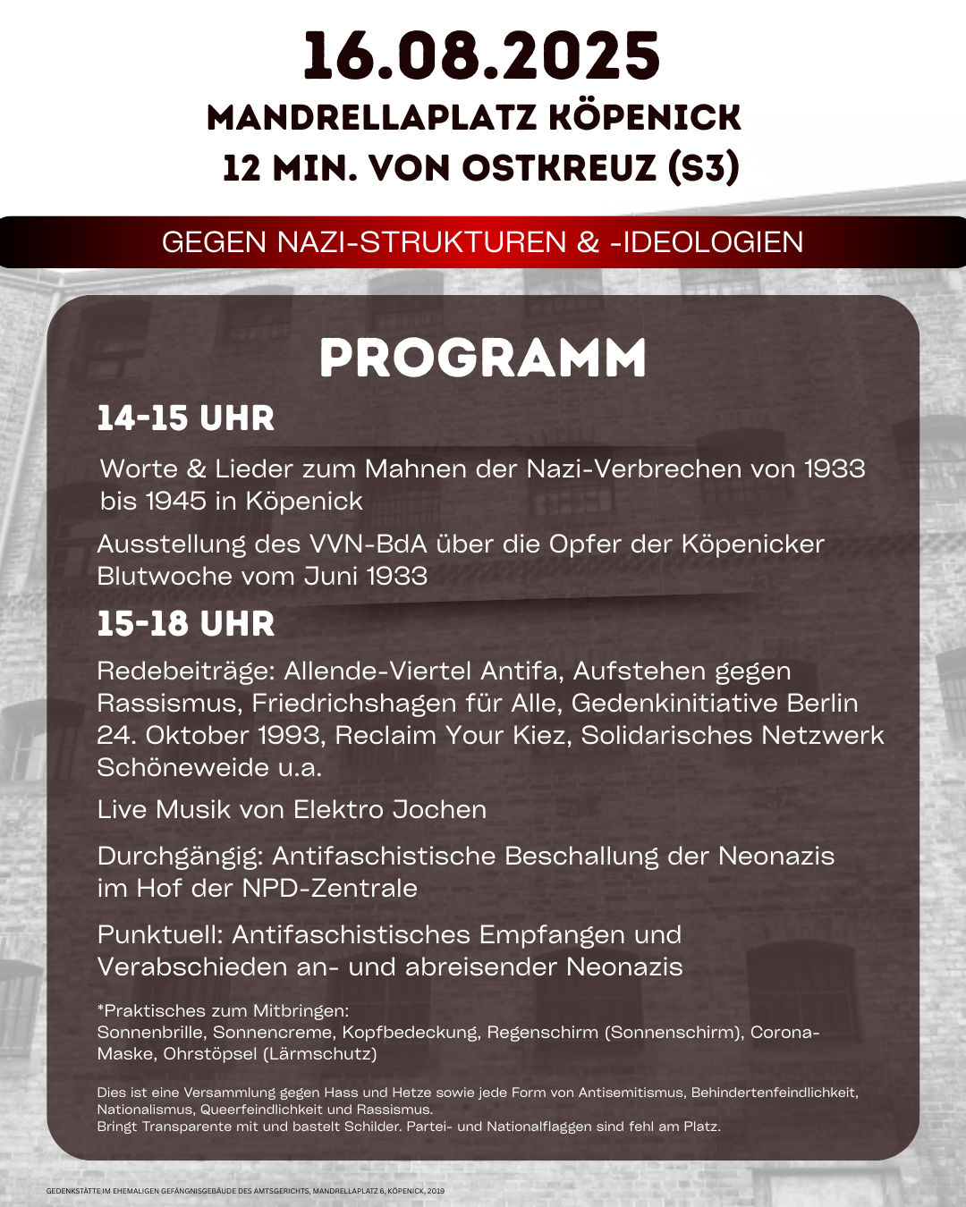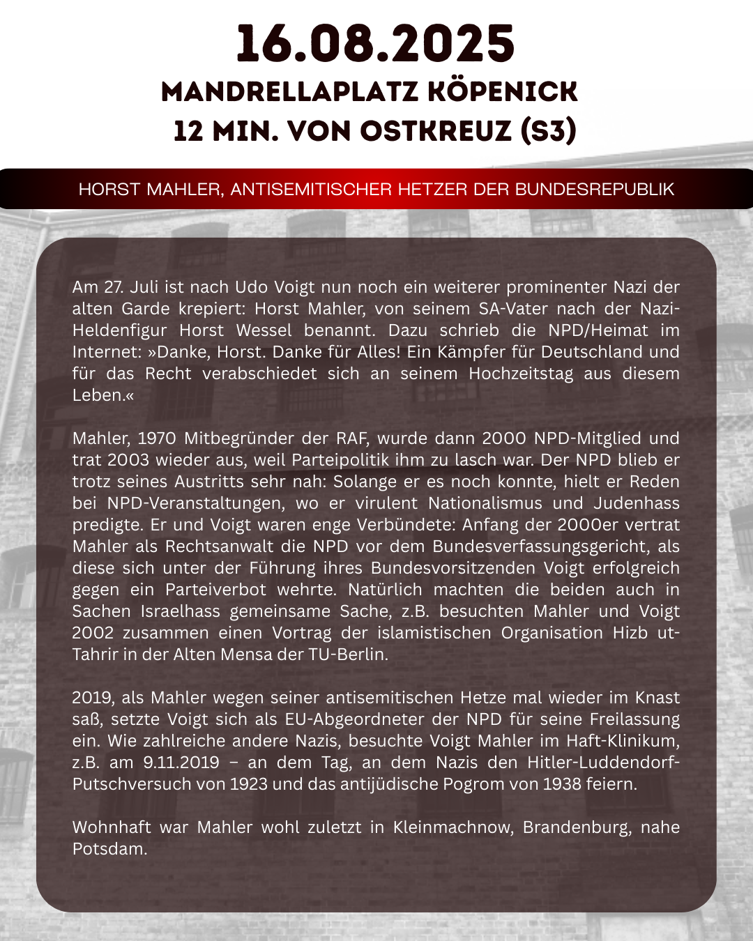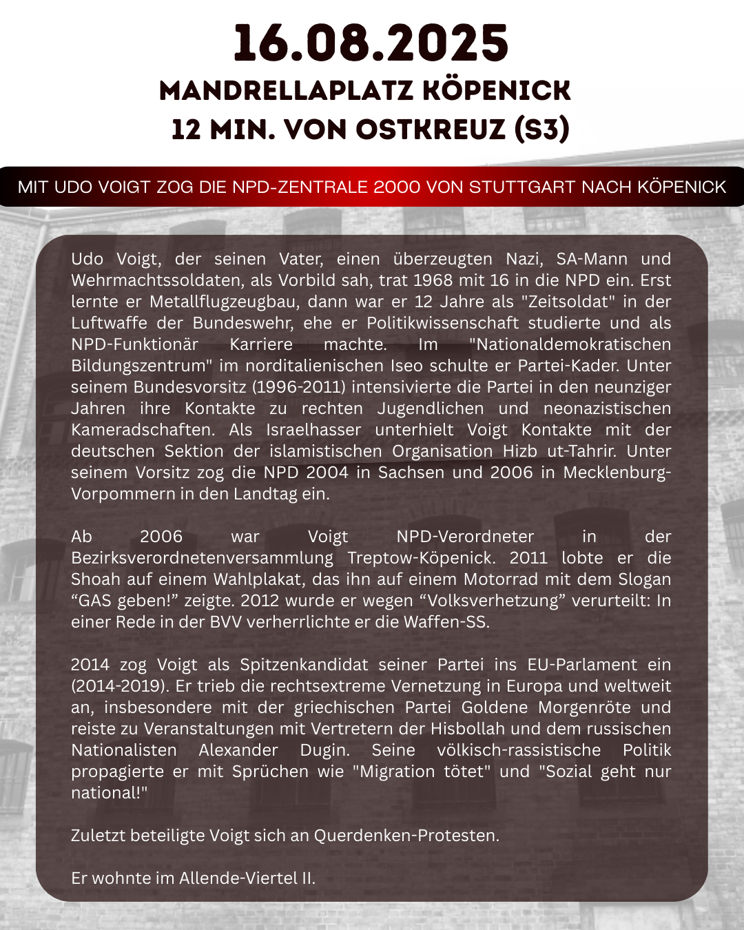 Für morgen, Samstag 16.08., haben die Nazis von der "Heimat" von 12-16 Uhr eine "Mahnwache Udo Voigt" vor der Kiekebuschstr. 12 in Köpenick, ca. 80 Meter von ihrer Parteizentrale, angemeldet.