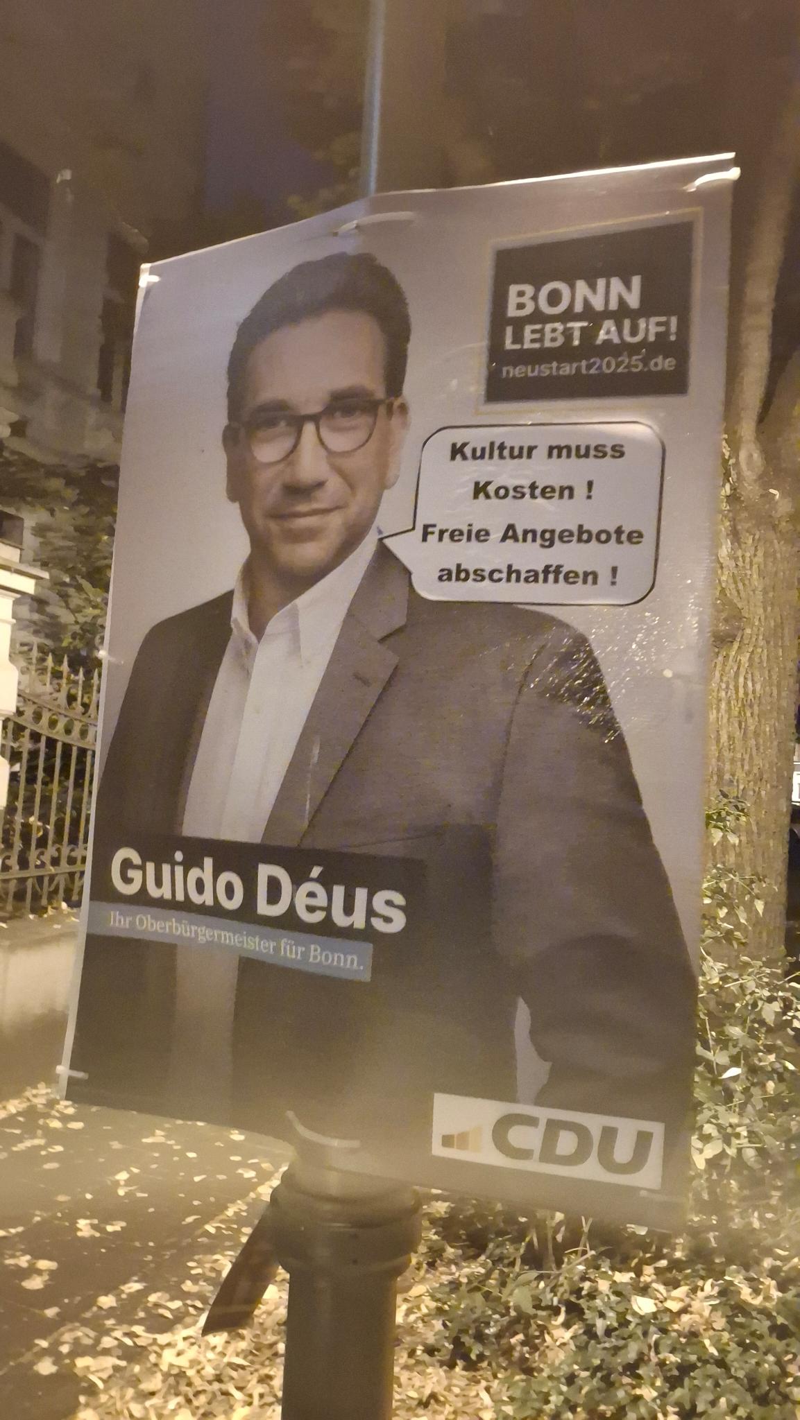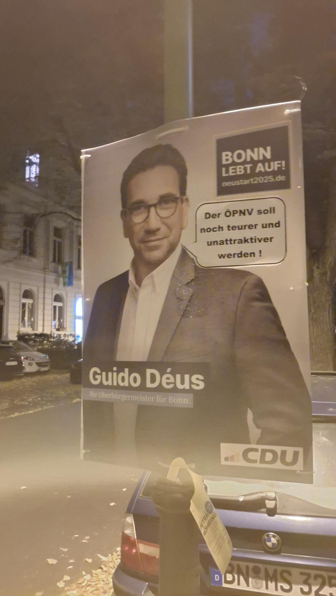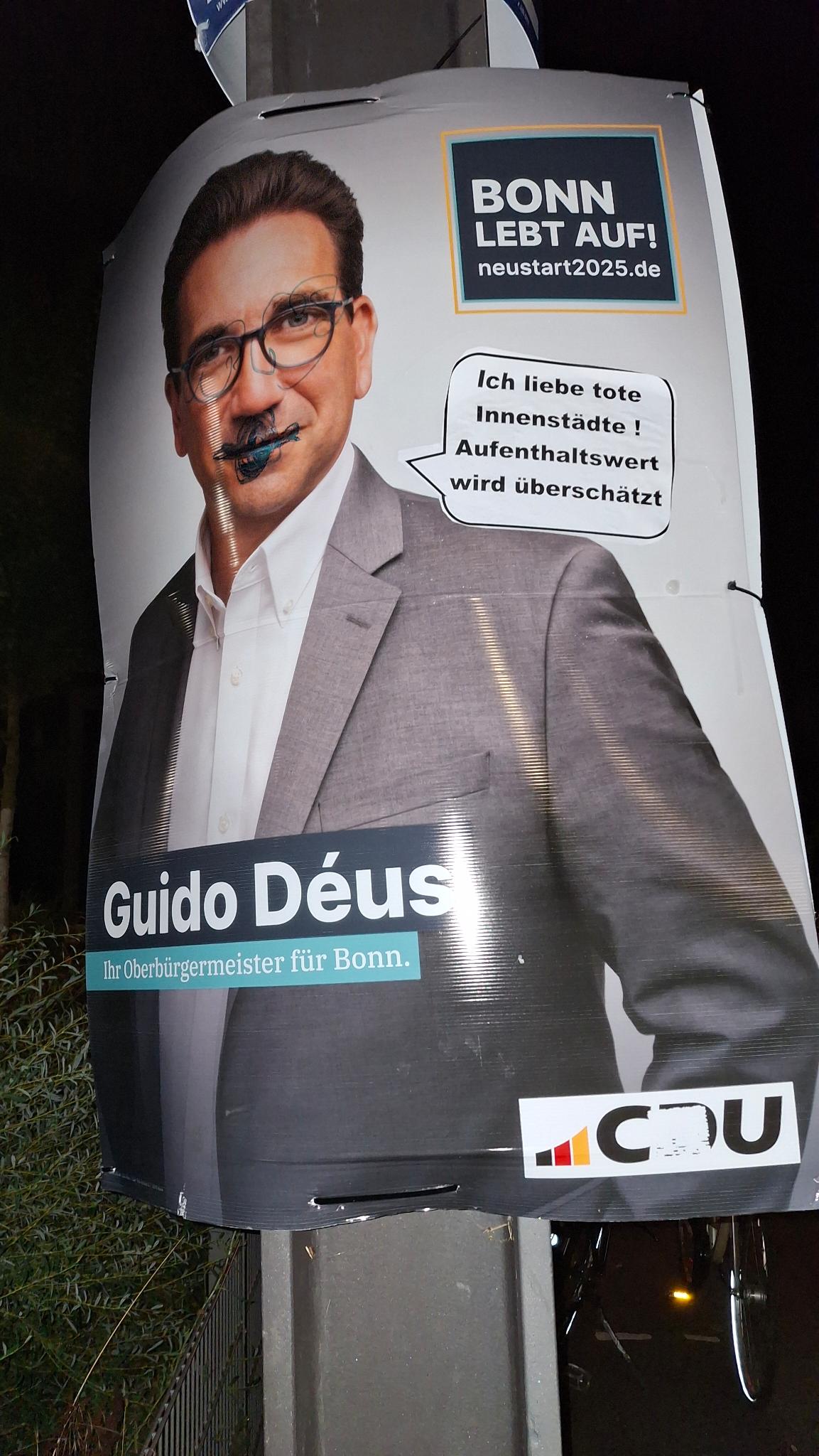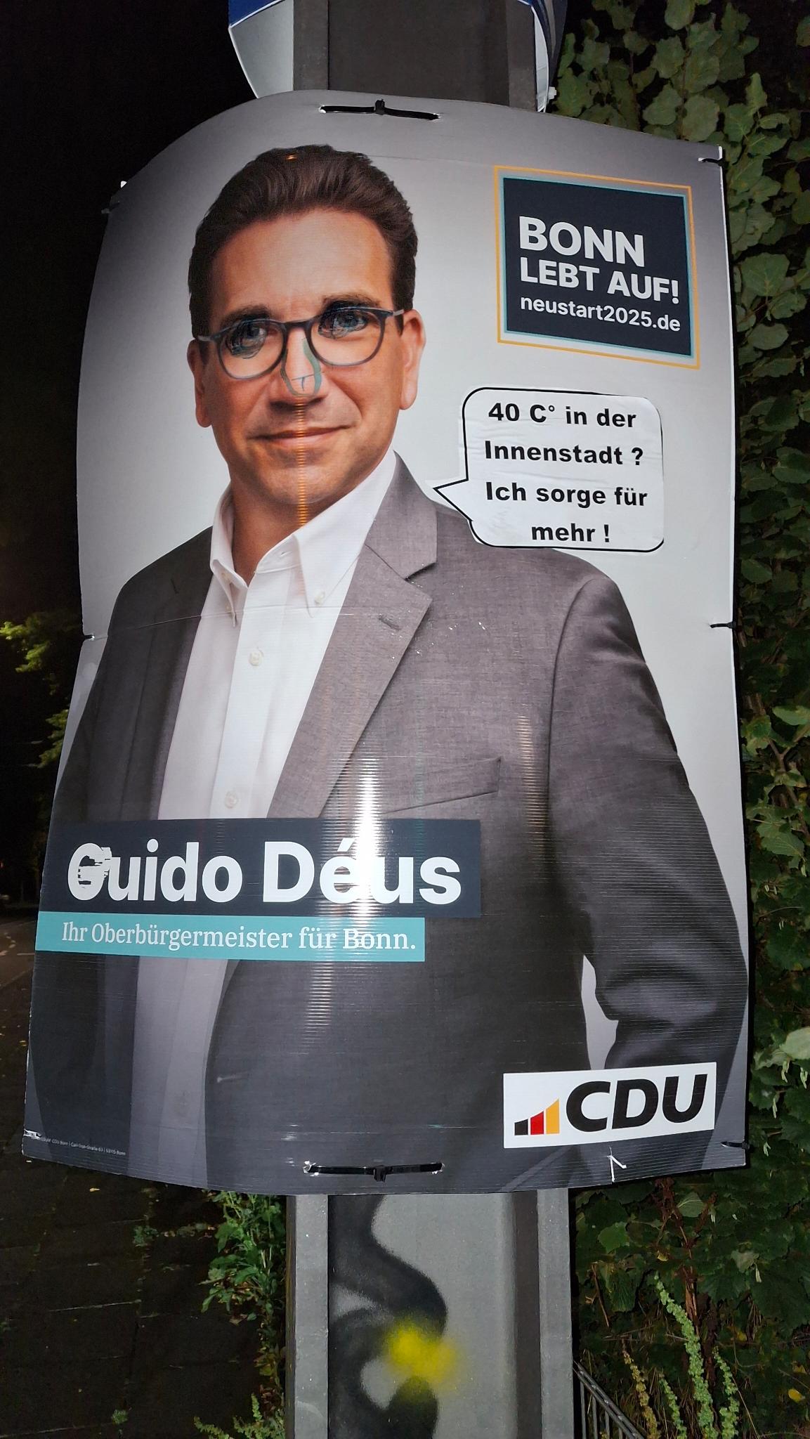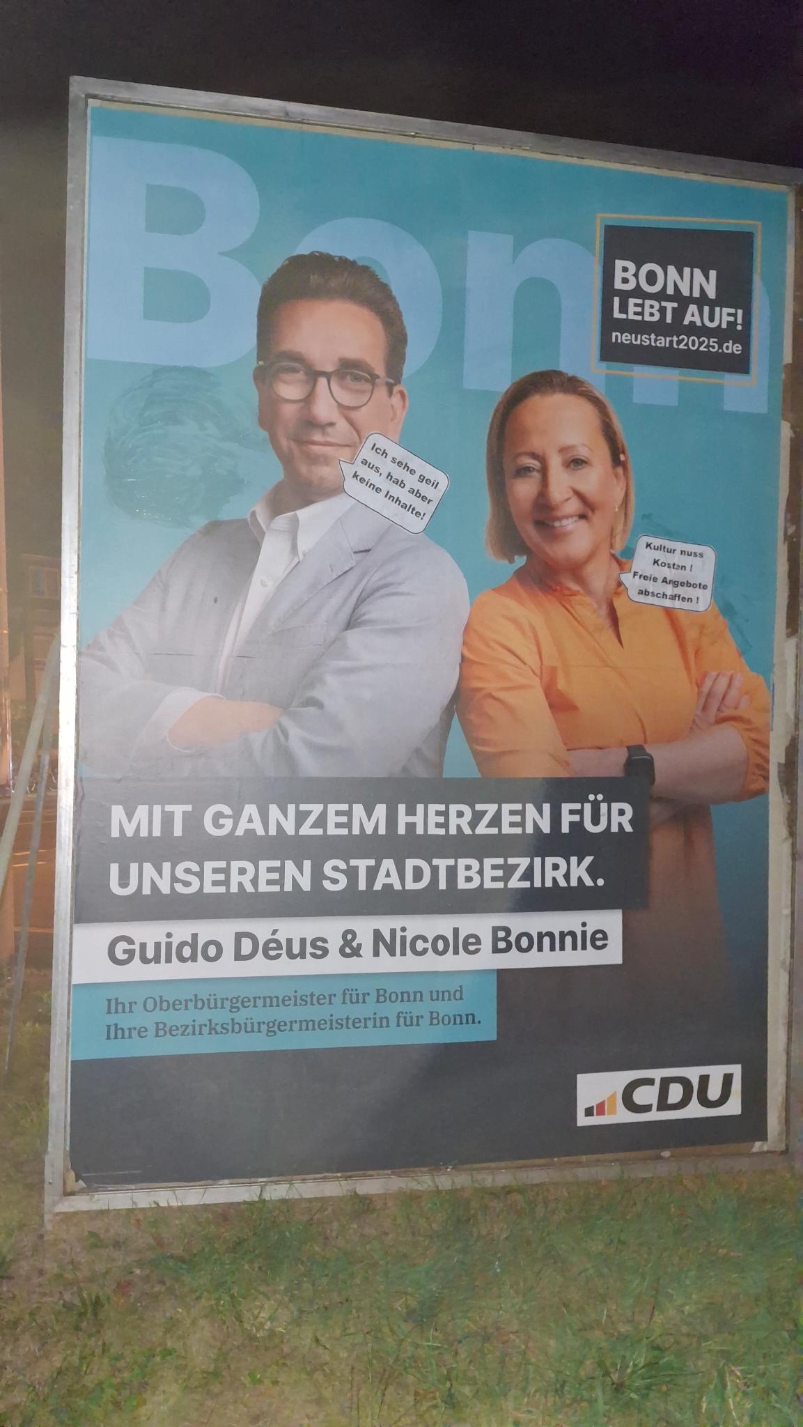 Um der CDU-Wahlkampagne den letzten Schwung zu verleihen, hat die CDU-nahe Marketingagentur Markusius & Söhne GmbH Geld und Zeit in die Hände genommen und die Kernbotschaften des CDU-Oberbürgermeister-Kandidaten Guido Déus auf rund 200 Wahlplakaten ergänzt. Dazu wurden in der vergangenen Nacht in verschiedenen Stadtteilen Bonns Sprechblasen auf den Plakaten angebracht. Die Agentur verleiht damit ihrem Wunsch Ausdruck, die CDU solle sich stärker auf Inhalte konzentrieren, auch um sich so explizit von Forderungen nach sogenannter Klimaneutralität, Nachhaltigkeit und sozial-ökologischer Transformation hin zu einer gerechteren Gesellschaft abzugrenzen. Das wolle man nun wirklich nicht, das Leben solle auf keinen Fall für alle Bürger besser werden. Man sei ja nicht Jesus.