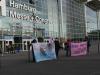 Aktivist*innen spannen Banner vor dem Eingang des Kreuzfahrt Industrie Kongresses "Seatrade Europe"