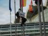 "Was hier unscheinbar innerhalb der Konferenz geschieht, ist nichts anderes als Gewinnmaximierung einiger Weniger auf Kosten von Arbeiter*innen und Umwelt. Wir finden, eine so schädliche Industrie sollte sich nicht in diesen Räumen verstecken und ungestört arbeiten können. Deswegen sind wir hier und sorgen dafür, dass auch von außen erkennbar ist, was hinter dieser Industrie steckt", erklärt Aktivist*in Alex P. die Aktion vorm Klettern an dem Fahnenmast.