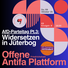 Im Oktober fährt die Berliner AfD wieder nach Jüterbog, um dort ihren Parteitag abzuhalten. Aufgrund unserer lauten Proteste und vielen Aktionen in der Vergangenheit, ist das zumindest für die Berliner AfD hoffentlich das letzte Mal in Jüterbog - wir sagen Tschüss und auf Nimmerwiedersehen! Doch das reicht leider nicht, denn die Brandenburger AfD soll weiterhin in der Wiesenhalle tagen dürfen. Deswegen fahren wir am 11. Oktober auch wieder hin, um zu zeigen: Kein Raum der AfD! Wir setzen ein Zeichen gegen die menschenfeindliche Politik der AfD in Berlin, Brandenburg und überall.
