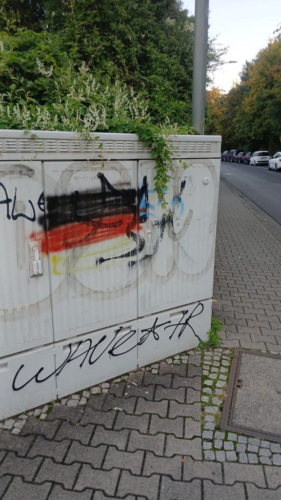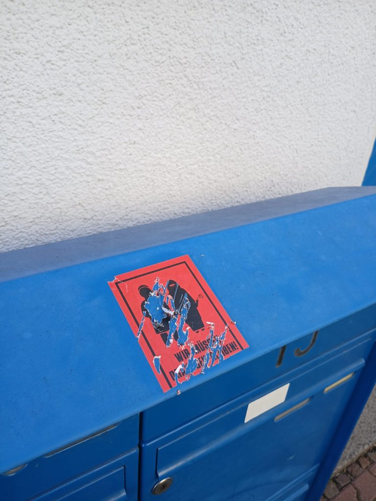 <p>In den Straßen unseres Viertels sind vermehrt <strong>rassistische Sticker</strong> aufgetaucht. Parolen gegen <strong>Geflüchtete</strong> und <strong>Menschen mit Migrationshintergrund</strong> sowie Bilder, welche unter anderem eine <strong>Muslima</strong> mit einer Bombe zeigen, sind vielen Menschen übel aufgestoßen. Doch das war es noch nicht: Über all im Viertel wurden <strong>rechte Schmierereien </strong>angebracht und die Sticker sowie ein Meer aus Deutschlandwimpeln wurde mit einer <strong>extrem hautreizenden Chemikalie besprüht.</strong> Vermutlich um die Höchster:innen zu verletzen, die <strong>keine rechte Propaganda in ihrem Viertel </strong>haben wollen.</p>
