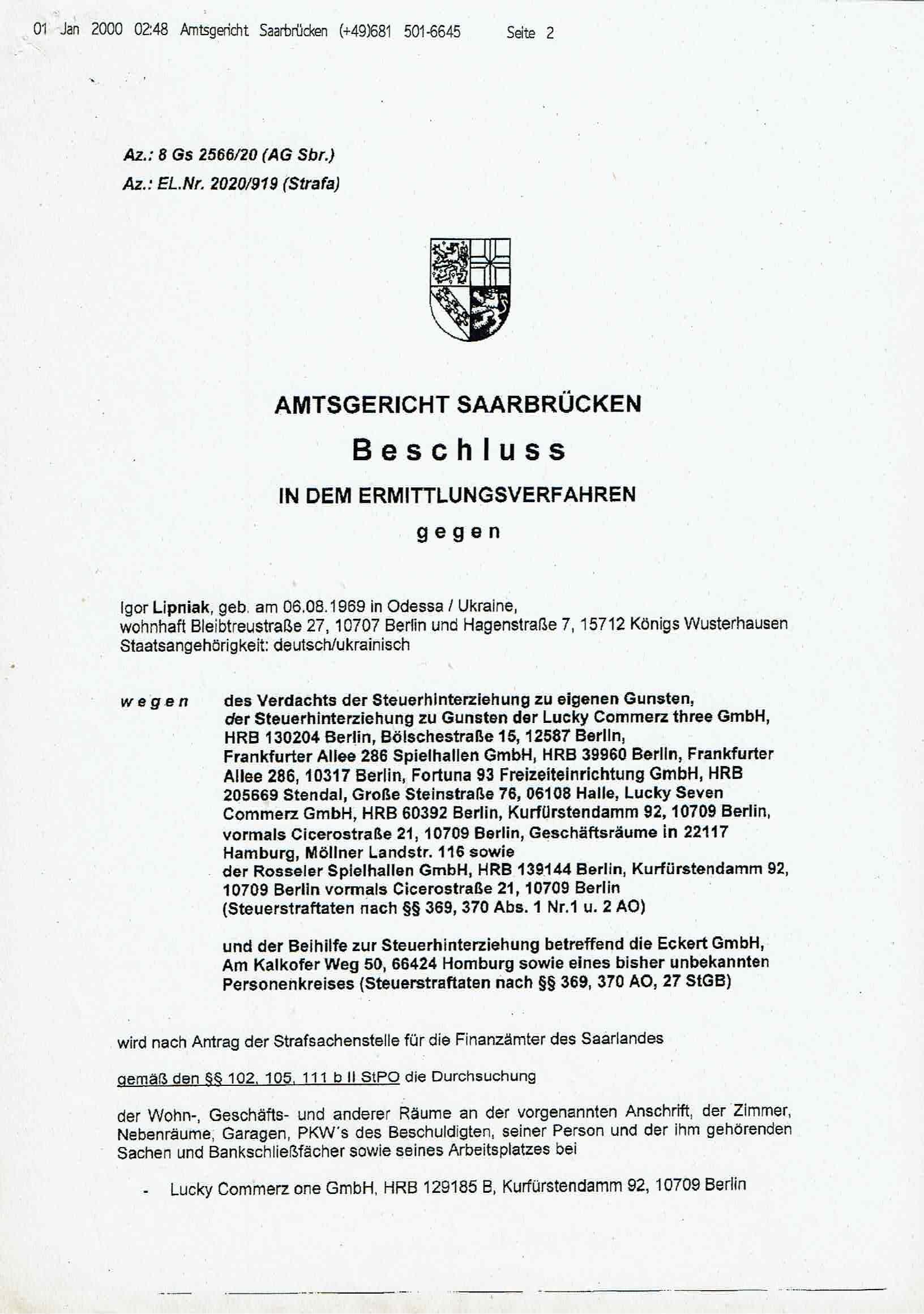 Im Jahr 2020 durchsuchten Steuerfahnder mit Beschluss des Amtsgerichts Saarbrücken das Büro der beiden sowie diverse andere Anschriften in Berlin, Halle und Hamburg. Igor Lipniak soll überrgional Laptops mit Software zur steuerlichen Manipulation von Spielautomaten vertrieben haben, ihm wird in dem Verfahren vorgeworfen die Erträge hieraus naheliegenderweise nicht versteuert zu haben – sowie auch in eigenen Spielhallen zu betrügen.