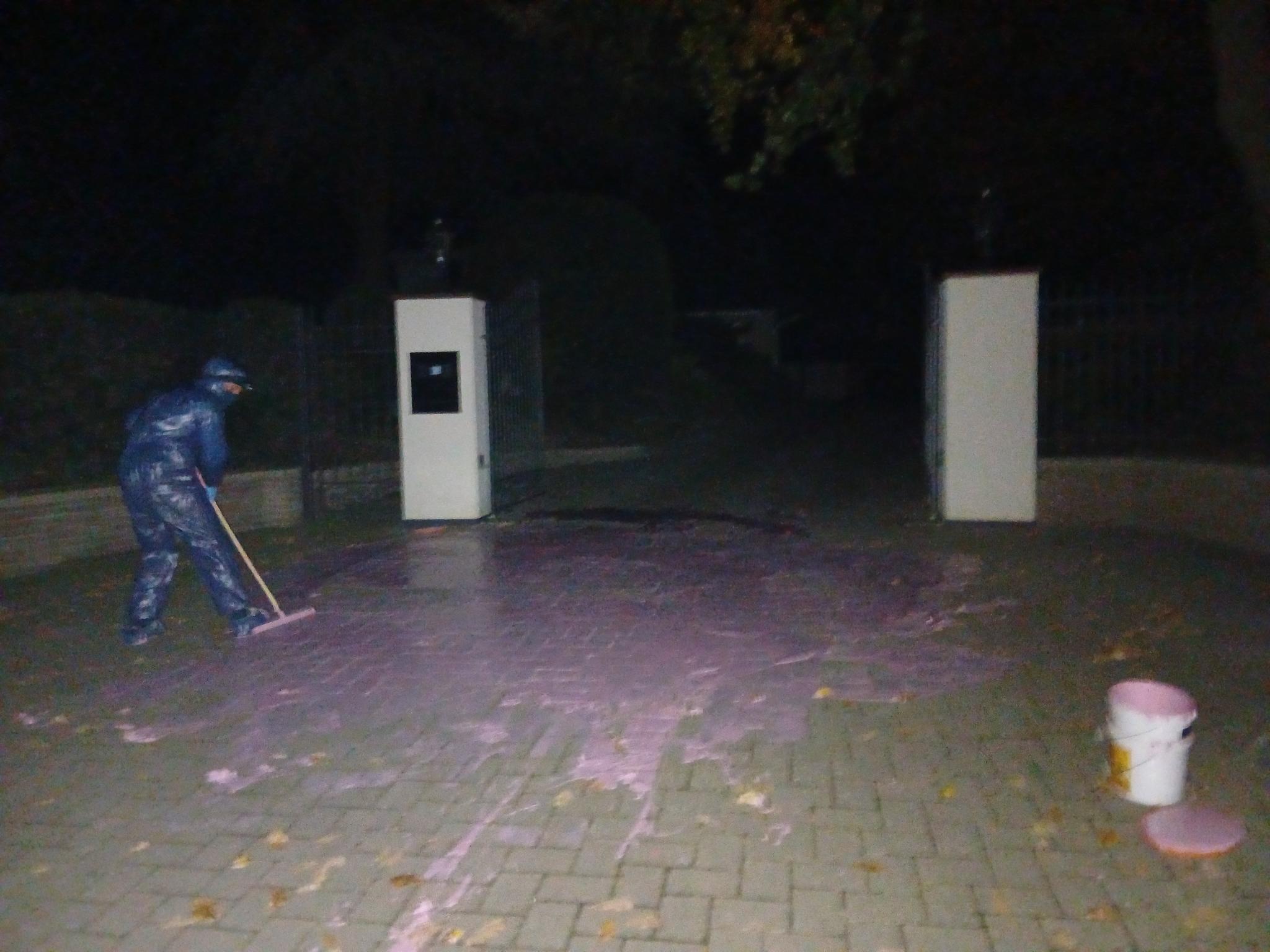 Farbe auf der Einfahrt und dem Weg zur Villa von Paul-Heinz Wesjohann verschuettet.