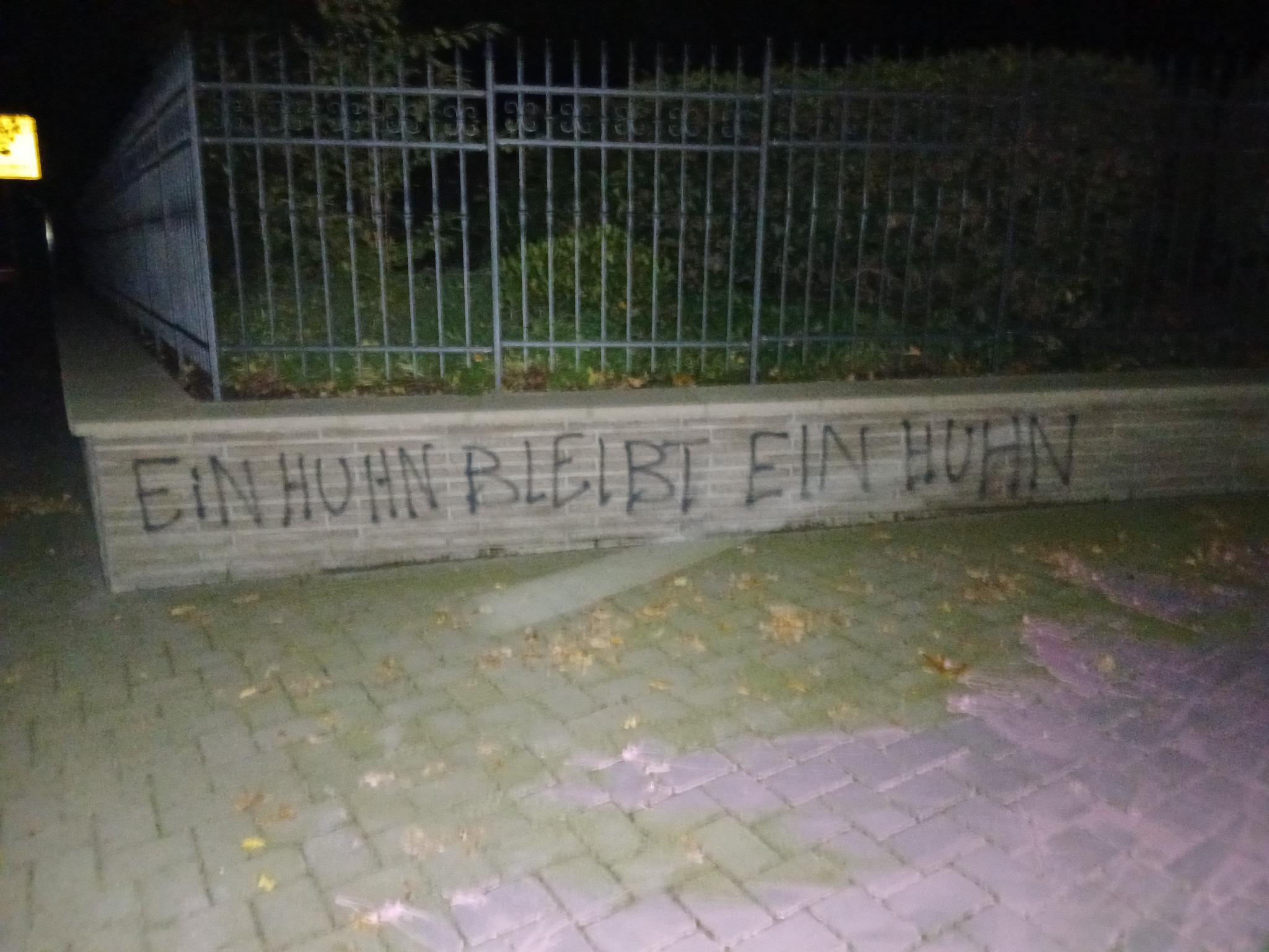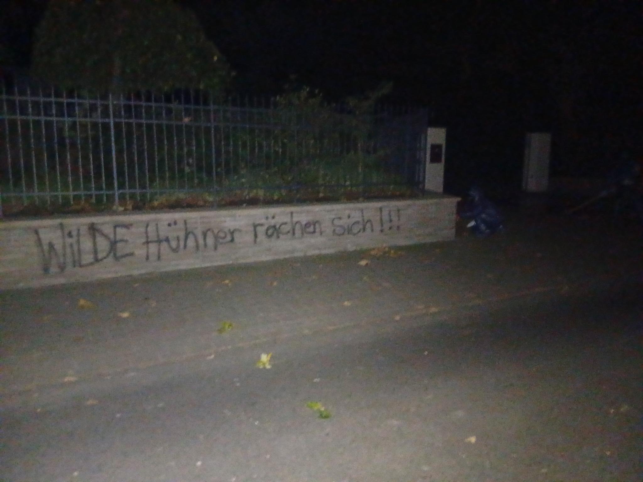 Zudem wurde die Mauer um das Grundstueck mit Spruechen wie "Wilde Huehner waehren sich" oder "Ein Huhn bleibt ein Huhn und ein Arsch bleibt ein Arsch" verziehrt.
