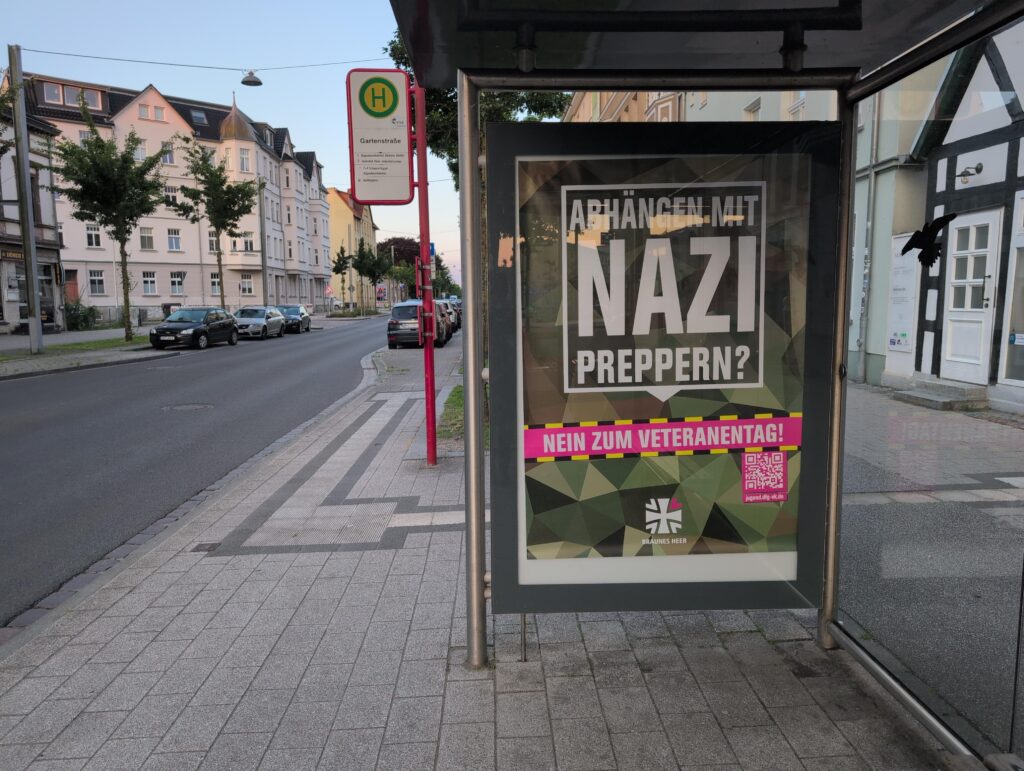 Anlässlich des ersten Veteranentags am 15. Juni hatten Aktivist:innen in 15 Städten aus 12 Bundesländern Werbevitrinen gekapert und dort Plakate im Design der Bundeswehr platziert. Doch an Stelle von Werbung für’s Militär stand auf den Postern: „Mit Nazipreppern abhängen? Nein zum Veteranentag!“ und „Deutscher Mix: Nazis, Patronen, Einzelfälle. Nein zum Veteranentag!“ Kai N. Krieger erklärt die Aktion: „Die Sprüche sind Anspielungen auf eine Reihe rechter Skandale rund um die Bundeswehr und die Veteranenverbände. Mit den gefälschten Adbusting-Plakaten wollten wir irritieren und Menschen zum Nachdenken bringen.“