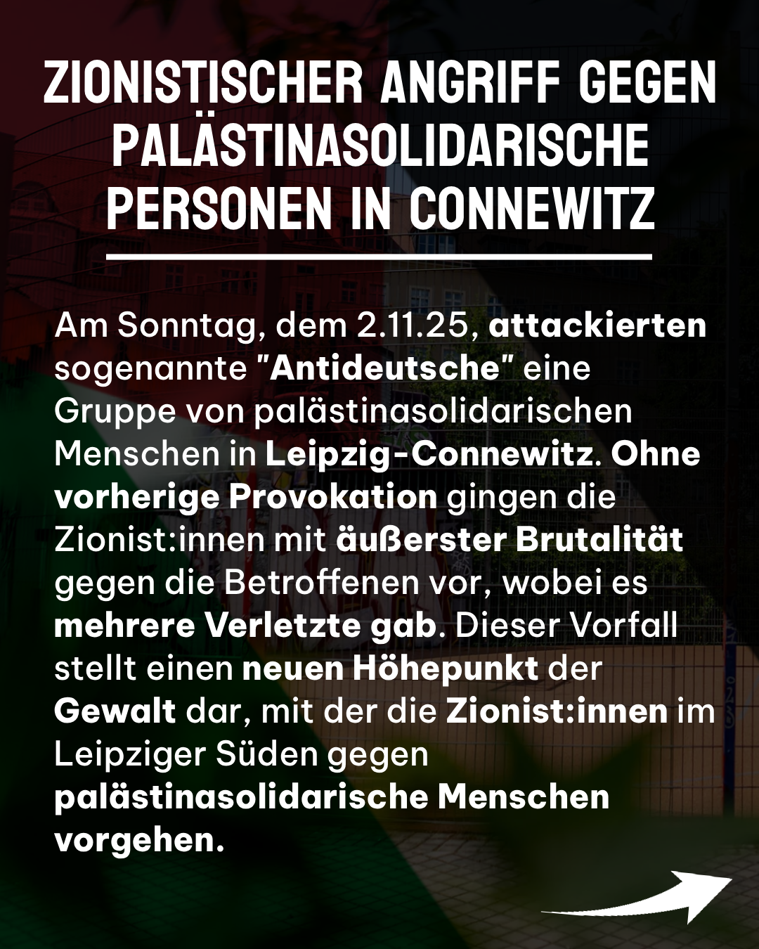 Dem Angriff ging eine Kundgebung von einer antideutschen Organisation am Connewitzer Kreuz aus. Dort hieß es, man wolle unter anderem gegen "autoritäre Gruppen" vorgehen. Nach Ende der Veranstaltung begab sich ein Teil des zionistischen Mobs in Richtung Bornaische Straße, wo sich zu dem Zeitpunkt eine Gruppe junger Menschen befand, die teilweise Kufiyas trugen. Nicht überraschend ist, dass es sich bei den Anti-Ds mal wieder um alkoholisierte Männer mittleren Alters handelte. Ohne vorherigen Pöbeleien gingen die Zios nach einer kurzen Weile des Herumlungerns zur physischen Gewalt über. Dabei wurde einer schwerbehinderten Person mit einemschwerem Fahrradschloss gegen den Kopf geschlagen. Die Folgen sind eine leichte Gehirnerschütterung und eine Prellung. Auch eine nicht zur genannten Gruppe gehörende Person wurde angegriffen. Außerdem scherten sich die Täter:innen auch nicht darum, dass bei der Gruppe ein Kleinkind anwesend war. Mit Pfefferspray konnten die Schläger:innen abgewehrt werden. Insgesamt wurden 5 Personen verletzt. Im Anschluss flüchteten die Angreifer:innen. An ihre Stelle trat nun ein ortsbekannter zionistischer Journalist, der die Gruppe mit gewohnt hochnäsiger antideutscher Manier verhöhnte. Mit der selben Geisteshaltung stellten antideutsche Tastaturkrieger im Verlaufe des Abend noch die Lüge ins Internet, es hätte sich bei dem Geschehen um eine kurze Eskalation gehandelt, während es sich eindeutig um einen feigen, einseitigen Angriff handelte. Dieser Vorfall reiht sich ein in eine lange Liste von Übergriffen von Zios gegen antiimperialistische Linke im Leipziger Süden. Immer wieder versuchen die selbsternannten "Antiautoritären" mittels physischer Gewalt und Psychoterror palästinasolidarische Stimmen mundtot zu machen. Somit muss man die Antideutschen als eine Art Hilfspolizei begreifen, die neben den normalen Bullen und Geheimdiensten dort schnüffeln und prügeln, wo sich Widerstand gegen die "Staatsräson" regt. So attackierten die Zios bereits vor ziemlich genau einem Jahr einen Infotisch an der HTWK, wo über den Genozid in Palästina informiert wurde. Die darauffolgende Solidaritätskundgebung und der Gegenprotest der Staatsräsonler waren noch in etwa gleich groß. Nach weiteren Übergriffen an einem Späti im Viertel konnte eine Soli-Küfa bereits so viele Menschen erreichen, dass die feigen Zios fernblieben. Es gilt nun, an diese Erfolge anzuknüpfen. Die meisten Menschen haben inzwischen den verbrecherischen Charakter der israelischen Regierung und ihrer Kriege erkannt. Nur die fanatischsten Stiefellecker:innen des deutschen Imperialismus posieren heute noch stolz mit Israelflagge. Folglich gilt es nun, die antideutsche Dominanz in der Leipziger Linken zu brechen. Wir brauchen uns nicht von Reaktionär:innen im progressiven Gewand terrorisieren lassen. Eines steht fest: Wir werden diesen Angriff nicht vergessen und nicht unbeantwortet lassen. Sorgen wir dafür, dass wir bald in einer Stadt leben, in welcher Solidarität mit den Palästinenser:innen offen gezeigt und gelebt werden kann!