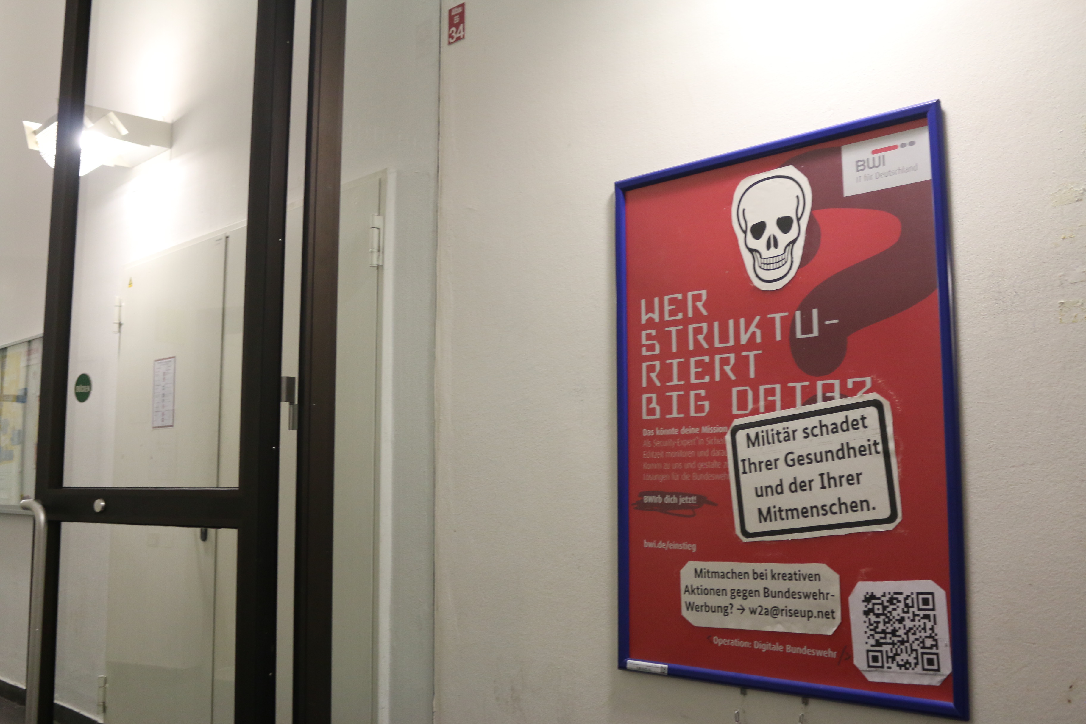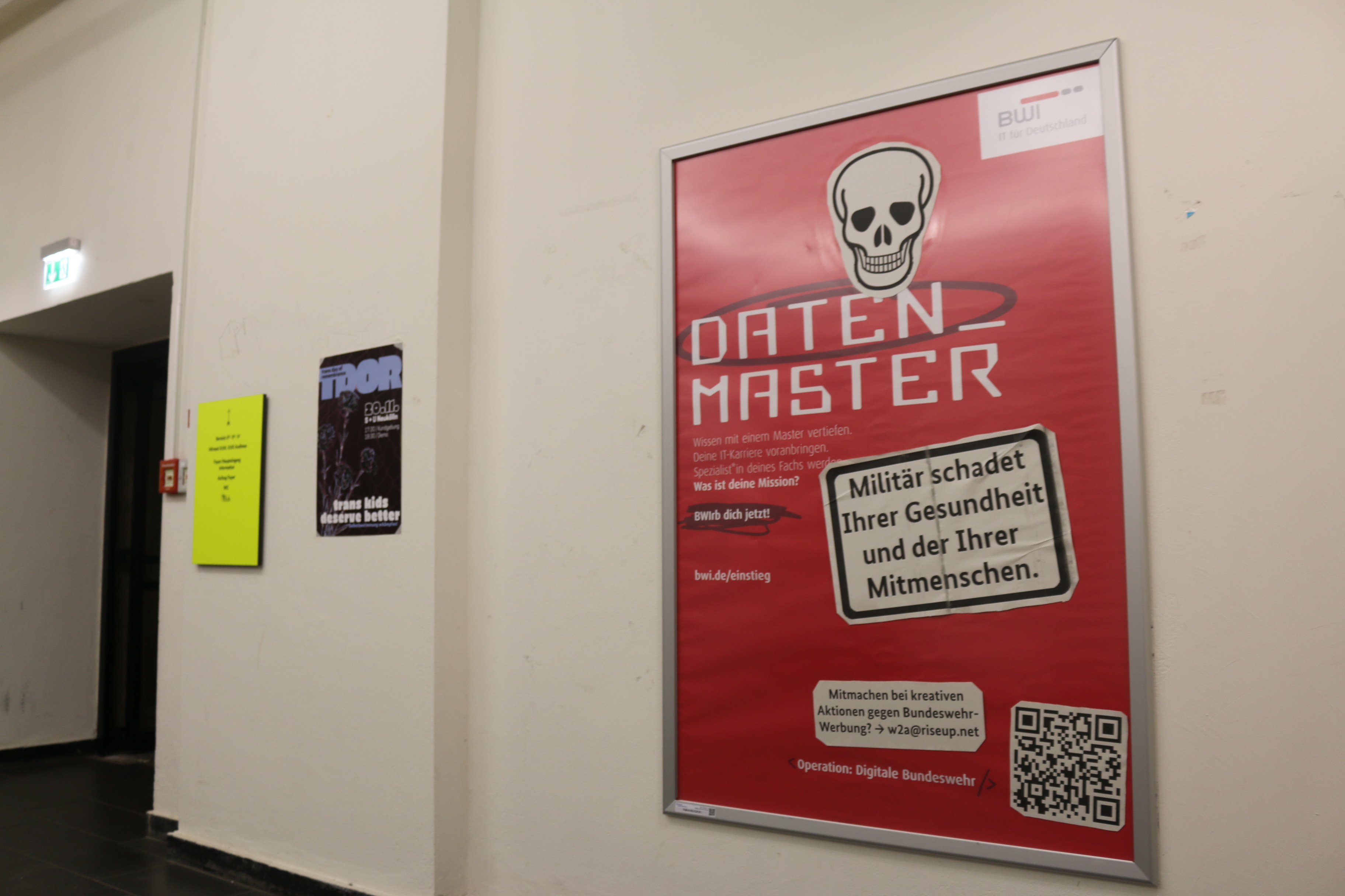 Die Aktiven der Werkstatt für Antifaschistische Aktionen (w2a) korrigierten alle Militär-Plakate im Hauptgebäude, der Chemie, der Hauptmennsa und dem EB. "Wenn ihr in weiteren Gebäuden auch Militär-Plakate seht, kümmert euch bitte drum!" appeliert Kai N. Krieger. Die Plakate befinden sich in Klapprahmen. Diese lassen sich mit bloßen Händen öffnen. "Schickt uns gerne Fotos von euren Aktionen an w2a@riseup.net!"