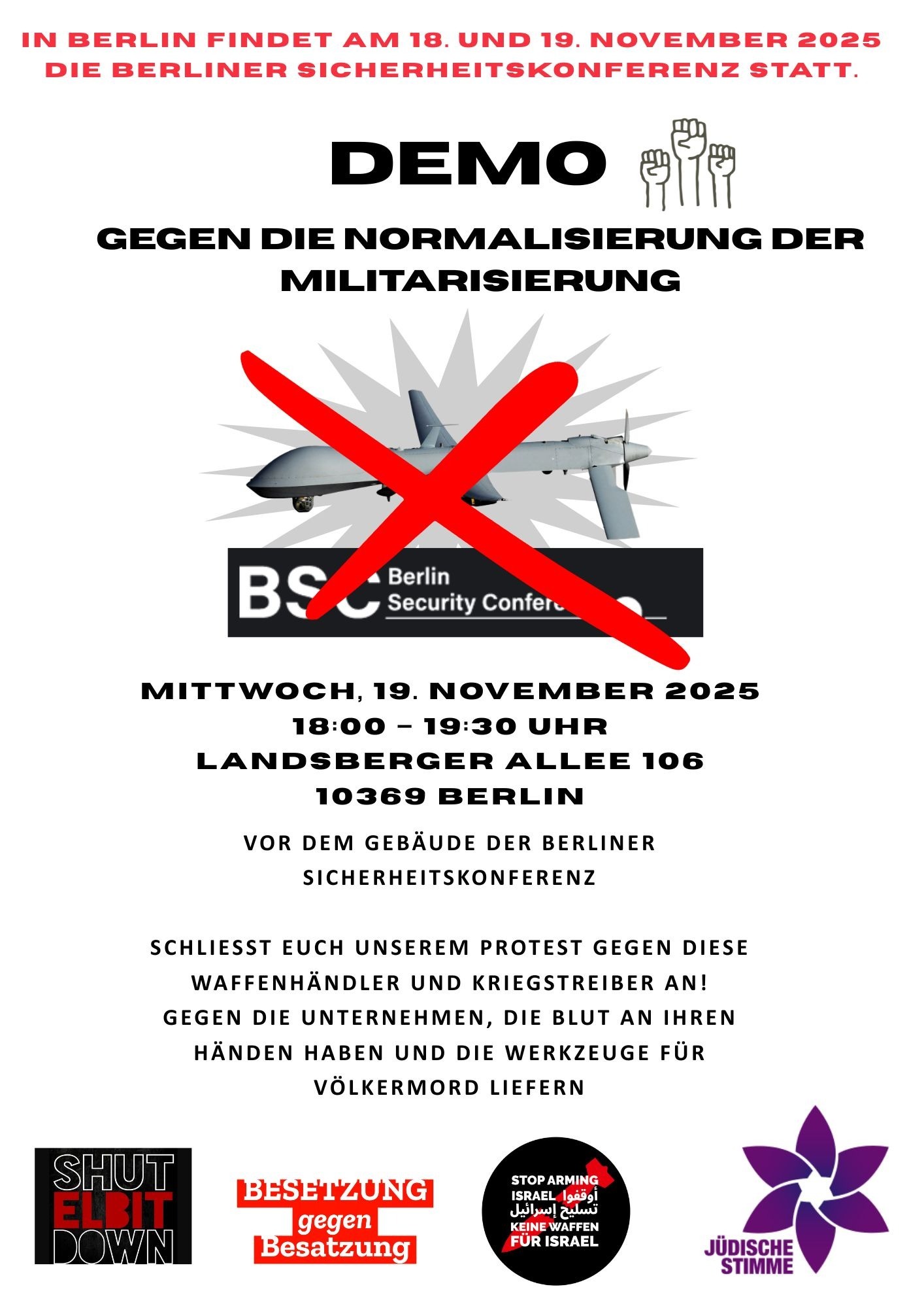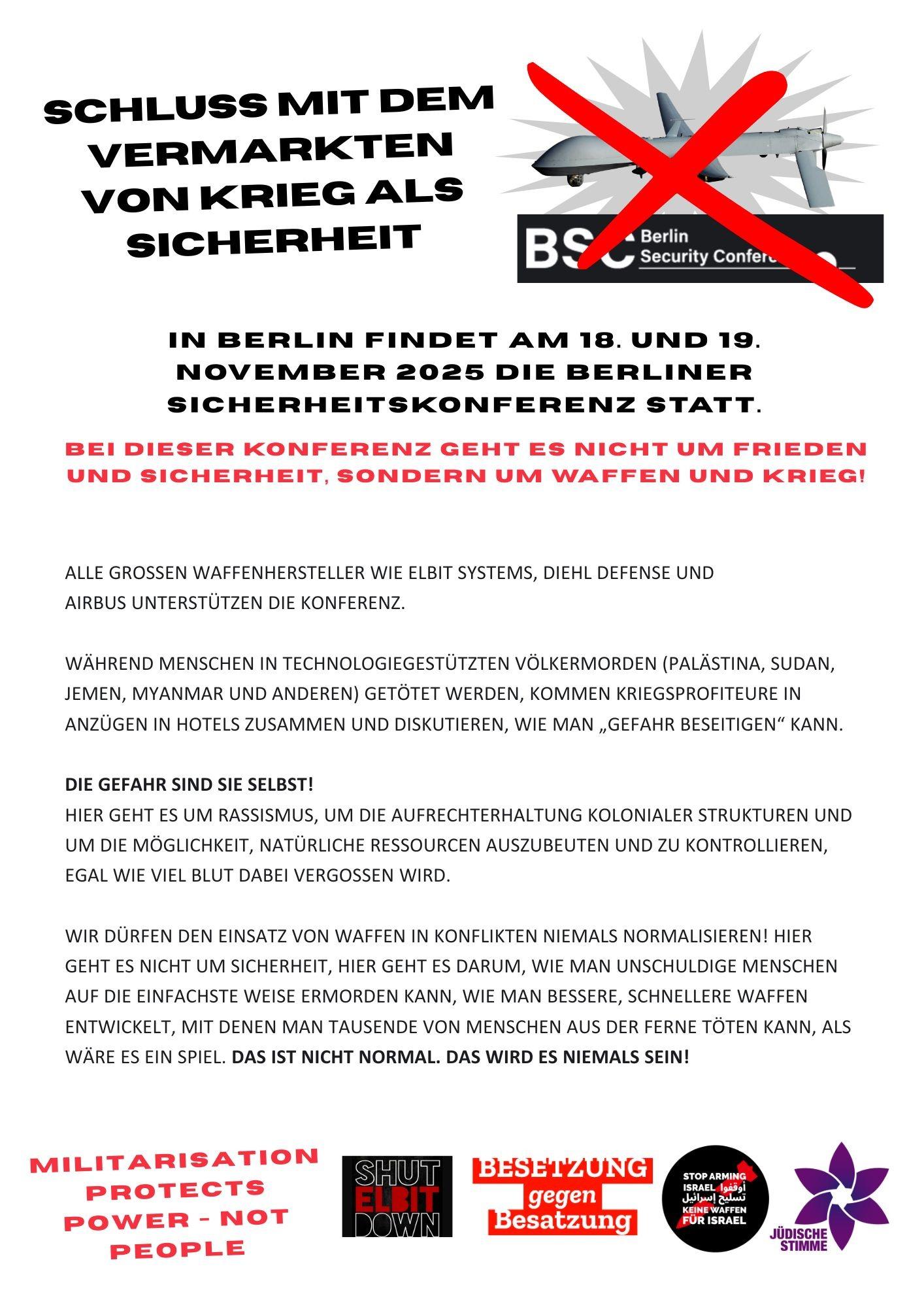 Als Bündnis haben wir bereits in unserem Aufruf zur antifaschistischen Demo am 22. November in Lichtenberg die Berlin Security Conference (BSC) und die Behördenspiegel-Gruppe als dessen Veranstalter*in thematisiert. Wir begrüßen die Aktion antimilitaristischer und palästinasolidarischer Gruppen gegen die Kriegskonferenz in unseren Kiezen. Wir rufen darum zur Beteiligung an der Kundgebung gegen die BSC.