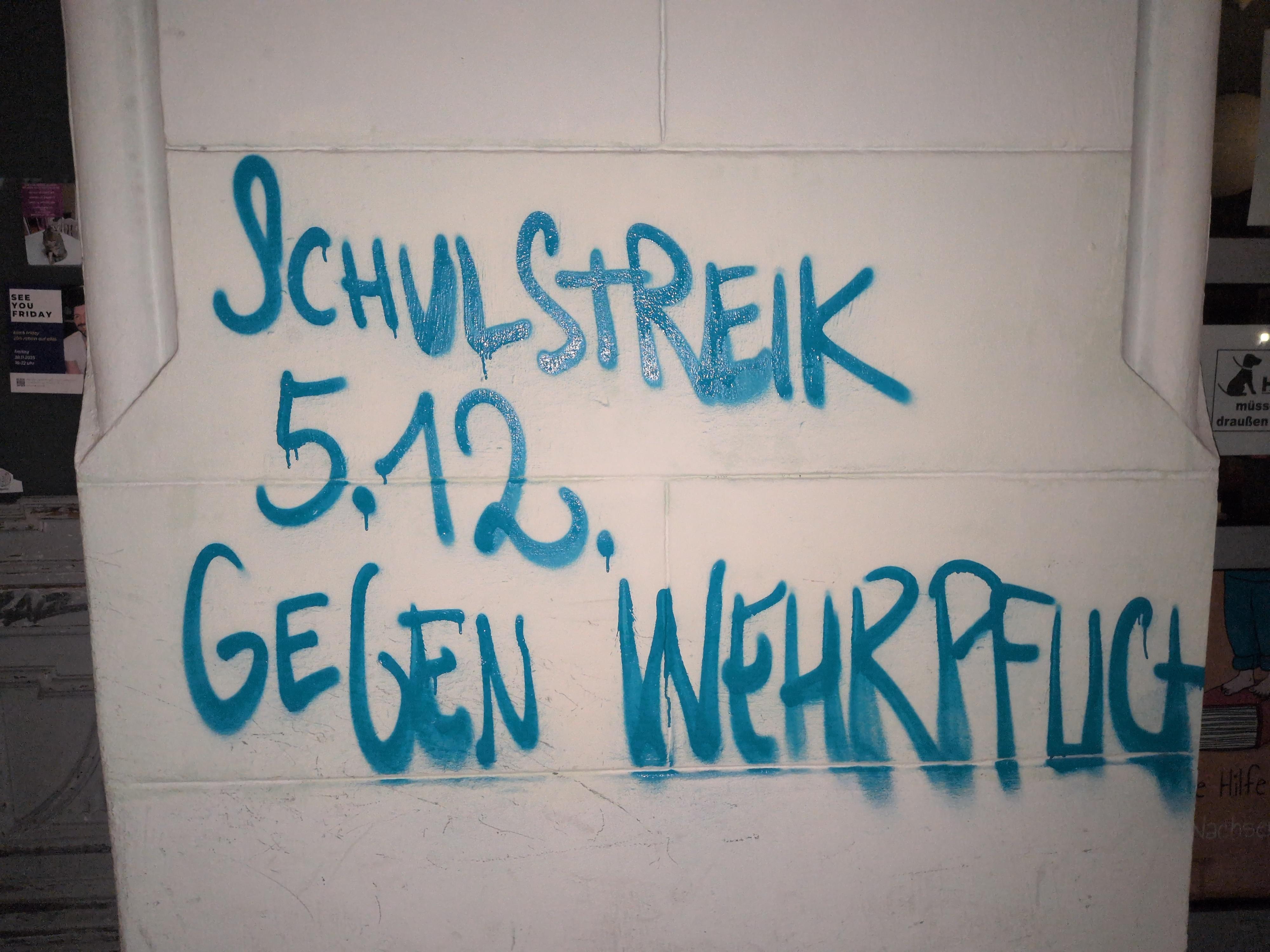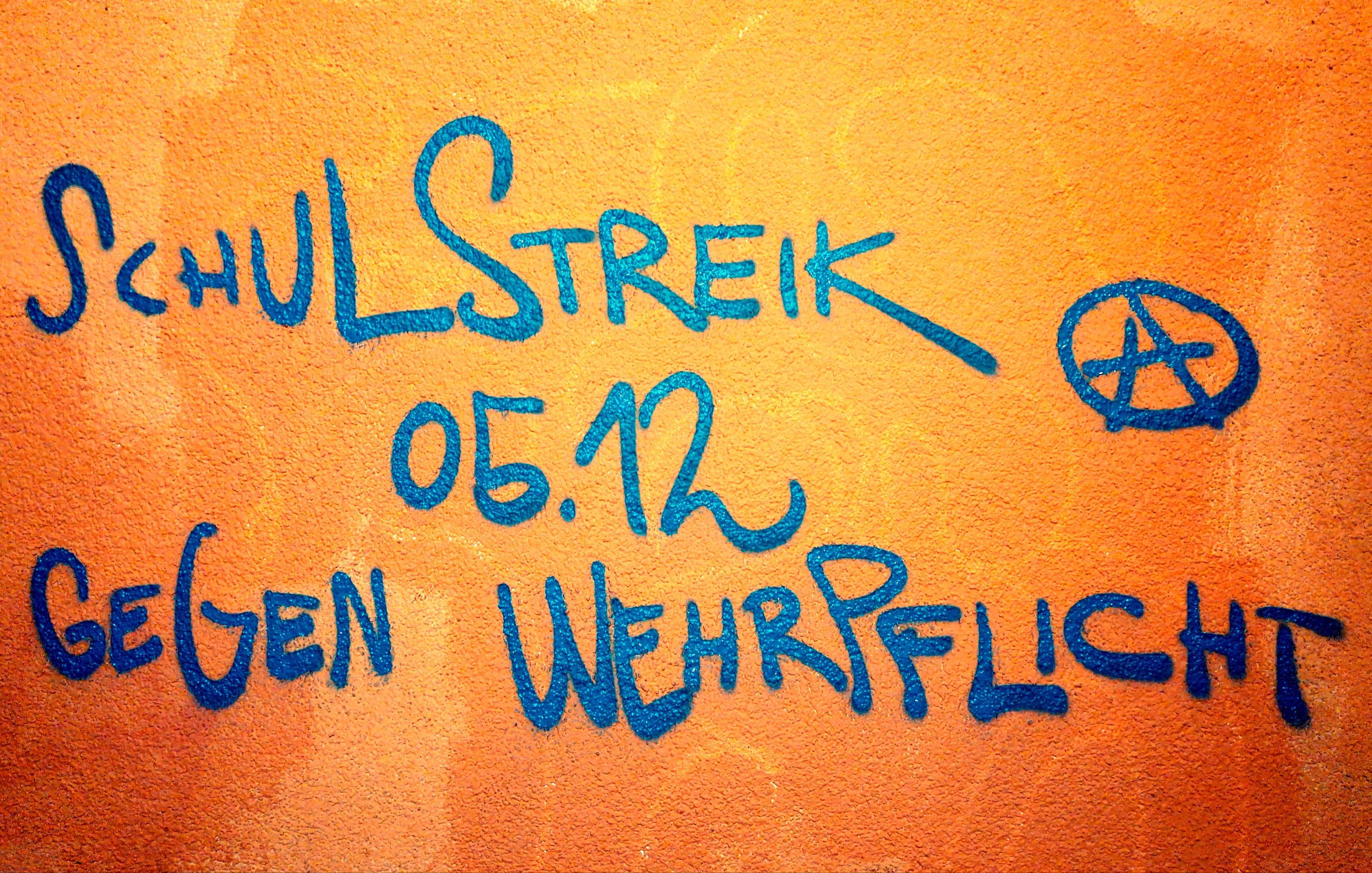 The increasing militarization and the creeping reintroduction of mandatory military service are prompting pupils to take the streets and go on strike. Fraud compromises, such as trading less rotten schools for a year in a military barracks, are not an option for them, which is why they are fundamentally opposed to militarization and mandatory military service.