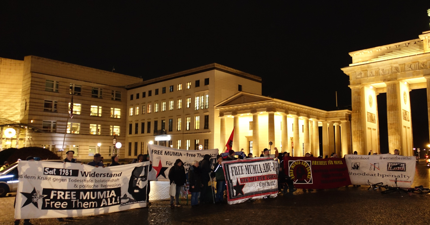 Am Dienstag, den 9. Dezember 2025 demonstrierten ca. 40 Menschen vor der US Botschaft am Pariser Platz in Solidarität mit Mumia Abu-Jamal. Der afroamerikanische Journalist ist für einen untergeschobenen Polizistenmord, für den es keine haltbaren Beweise gibt, seit 44. (!) Jahren im US Bundesstaat Pennsylvania in Haft. Zeitgleich demonstrierten Menschen für seine Freiheit in Pennsylvania vor dem SCI Mahanoy Gefängnis, in dem er festgehalten wird, sowie in Bern, London und Mexico City vor diplomatischen US Einrichtungen. Bereits am Mittwoch hatte es einen ähnlichen Protest in Paris vor der US Botschaft gegeben.