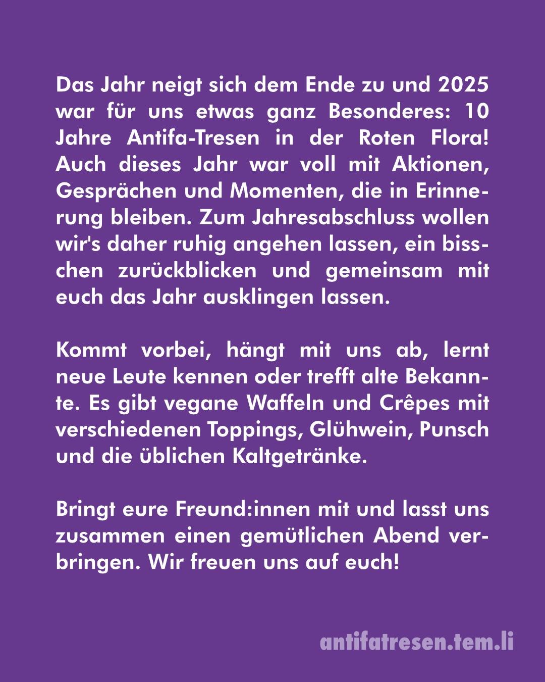 Das Jahr neigt sich dem Ende zu und 2025 war für uns etwas ganz Besonderes: 10 Jahre Antifa-Tresen in der Roten Flora!