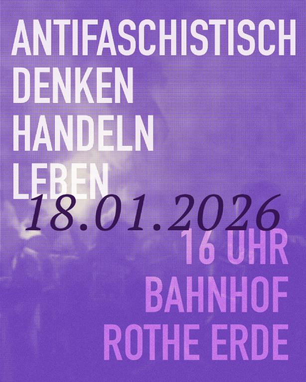 Am 18.01.2026 wollen wir nicht nur an den zurückliegenden Nazi-Aufmarsch erinnen, um ihn nicht zu einem größeren Thema zu machen, als er es verdient hätte. Nein, wir wollen vor allem ein starkes und unmissverständliches Zeichen gegen den voranschreitenden Faschismus setzen und weiterhin klarmachen, dass dieser, wo immer er sich Bahn bricht, er auf Gegenwehr stoßen wird.
