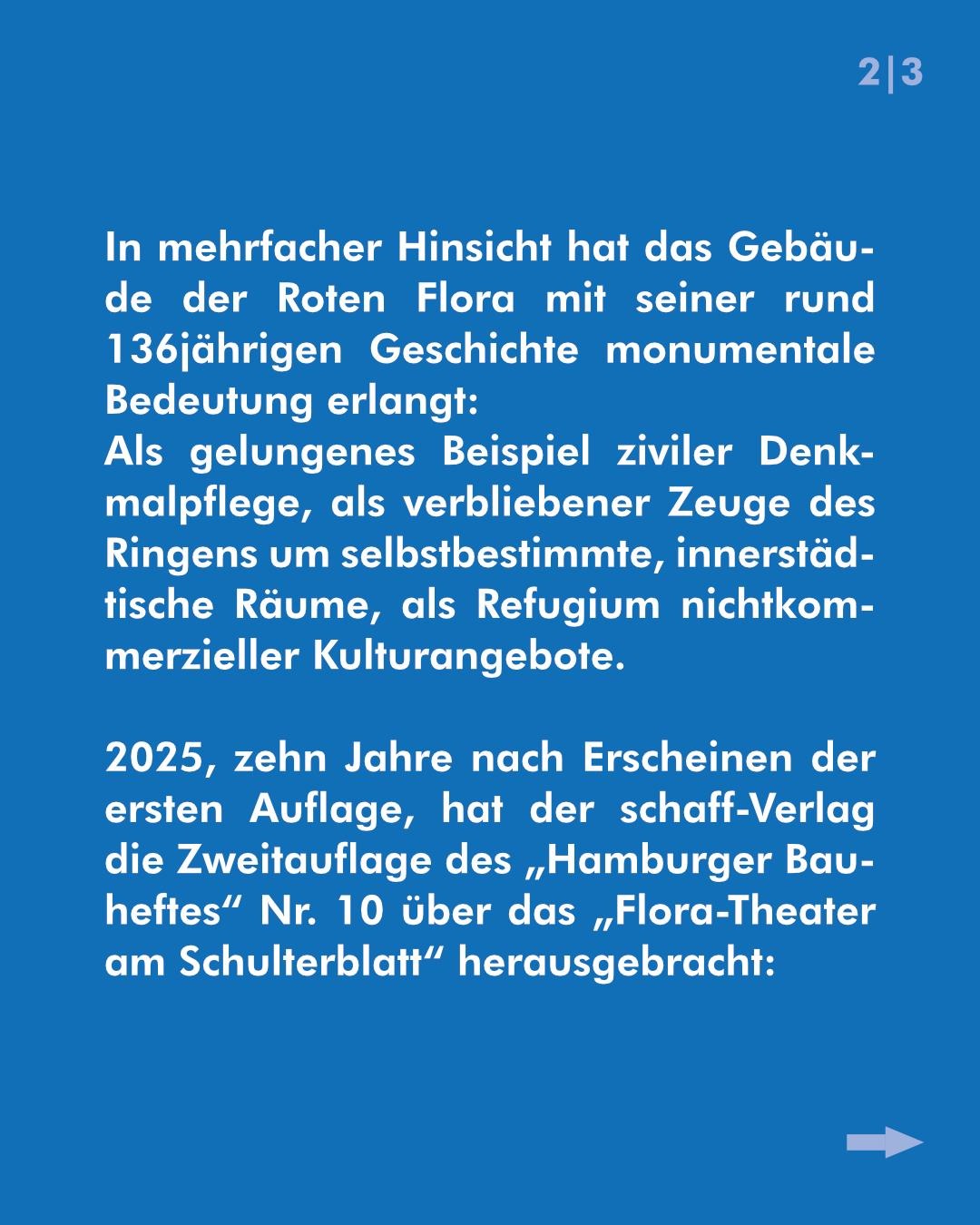 2025, zehn Jahre nach Erscheinen der ersten Auflage, hat der schaff-Verlag die Zweitauflage des „Hamburger Bauheftes“ Nr. 10 über das „Flora-Theater am Schulterblatt“ herausgebracht: Es beleuchtet die Baugeschichte dieses letzten, noch intakten Zeugnisses gründerzeitlicher „Feierabendarchitektur“ und würdigt die Leistungen des „Denkmalschutzes von unten“, wie sie von den Mitwirkenden im Zuge der „Sommerbaustelle“ 2015 vollbracht wurden.
