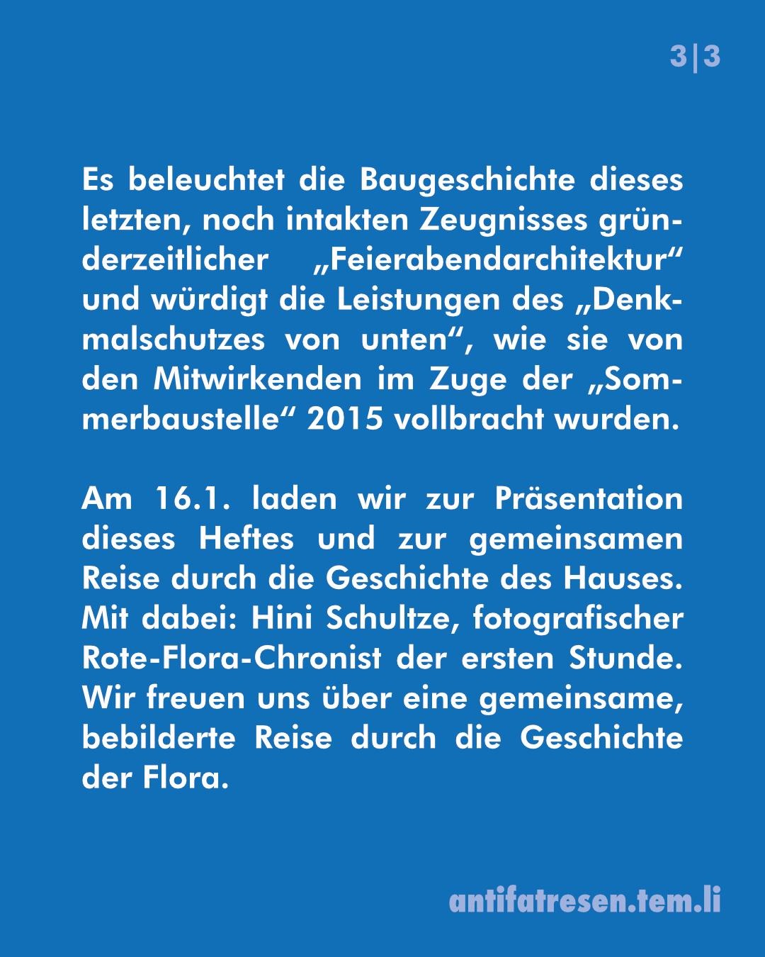 Am 16.1. laden wir zur Präsentation dieses Heftes und zur gemeinsamen Reise durch die Geschichte des Hauses. Mit dabei: Hini Schultze, fotografischer Rote-Flora-Chronist der ersten Stunde. Wir freuen uns über eine gemeinsame, bebilderte Reise durch die Geschichte der Flora.