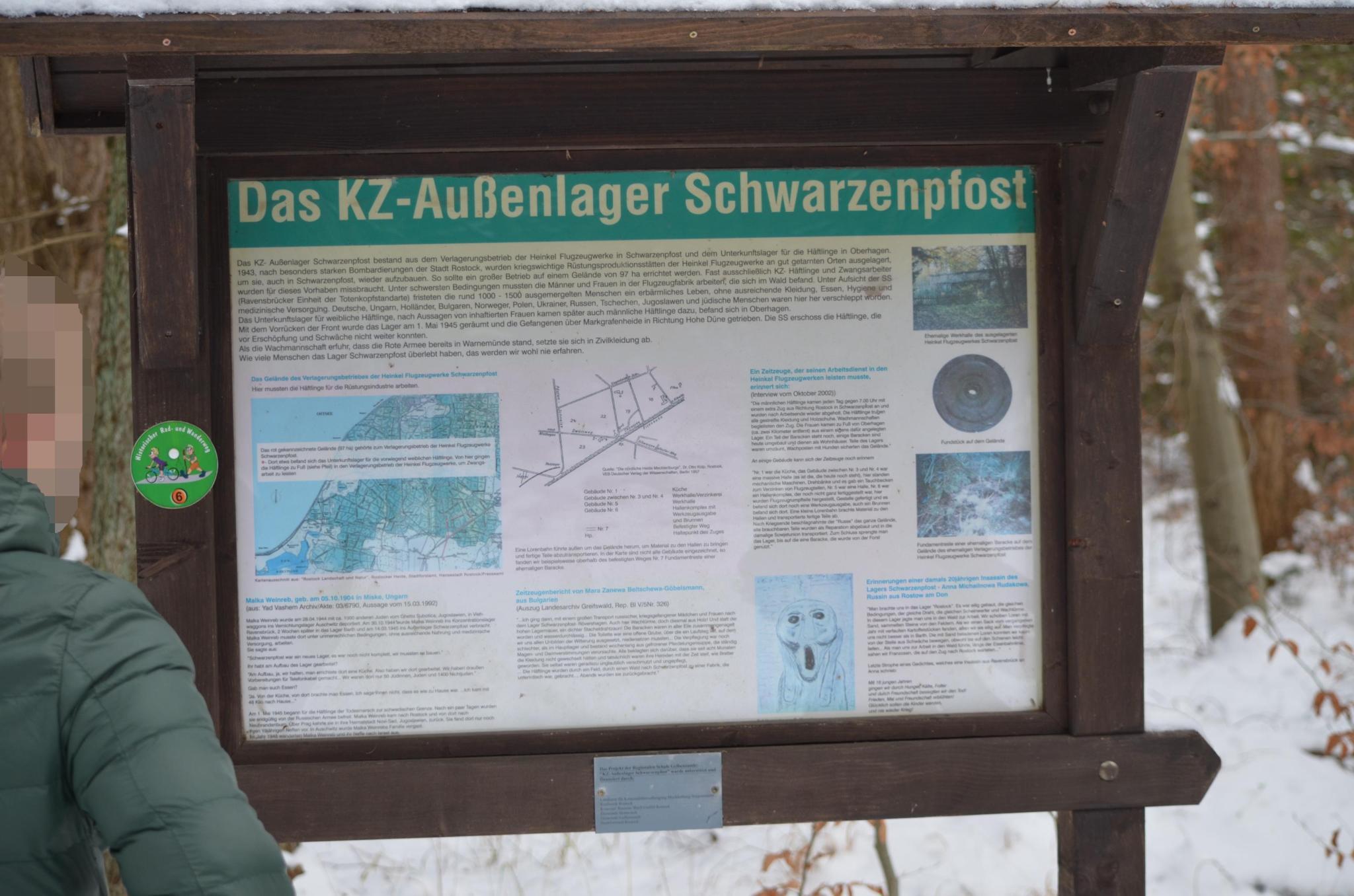 Das KZ-Außenlager Schwarzenforst bestand aus dem Verlagerungsbetrieb der Heinkel Flugzeugwerke in Schwarzenforst und dem Unterkunftslager für die Häftlinge in Oberhagen. 1943, nach besonders starken Bombardierungen der Stadt Rostock, wurden kriegswichtige Rüstungsproduktionsstätten der Heinkel Flugzeugwerke an gut getarnten Orten ausgelagert, um sie, auch in Schwarzenforst, wieder aufzubauen. So sollte ein großer Betrieb auf einem Gelände von ca. 100 ha errichtet werden. Fast ausschließlich KZ-Häftlinge und Zwangsarbeiter wurden für dieses Vorhaben missbraucht. Unter schwersten Bedingungen mussten die Männer und Frauen in der Flugzeugfabrik arbeiten, die sich im Wald befand. Unter Aufsicht der SS fristeten die rund 1.000 bis 1.500 ausgemergelten Menschen ein erbärmliches Leben, ohne ausreichende Kleidung, Essen, Hygiene und medizinische Versorgung. Deutsche, Ungarn, Holländer, Bulgaren, Norweger, Polen, Ukrainer, Russen, Tschechen, Jugoslawen und jüdische Menschen waren hierher verschleppt worden. Mit dem Vorrücken der Front wurde das Lager am 1. Mai 1945 geräumt und die Gefangenen über Markgrafenheide in Richtung Hohe Düne getrieben. Die SS erschoss die Häftlinge, die vor Erschöpfung und Schwäche nicht weiter konnten. Als die Wachmannschaft erfuhr, dass die Rote Armee bereits in Warnemünde stand, setzte sie sich in Zivilkleidung ab. Wie viele Menschen das Lager Schwarzenforst überlebt haben, werden wir wohl nie erfahren.