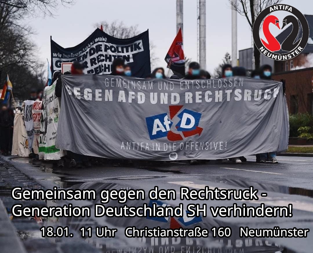 Am 18.01.2026 möchte die AfD Jugendorganisation Generation Deutschland einen Landesverband für Schleswig Holstein in Neumünster gründen. Wie schon bei der Gründung des Bundesverbandes Ende letzten Jahres in Gießen wollen wir das nicht einfach still hinnehmen und rufen auf, uns gemeinsam gegen die AfD zu widersetzen. Wir haben keinen Bock auf neofaschistische Hipster und rassistische Idioten in unserer Stadt und sagen ganz klar: Kein Fußbreit dem Faschismus!