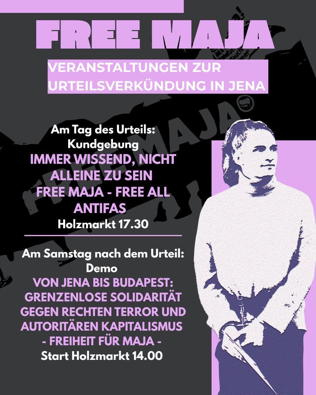Voraussichtlich am 4. Februar soll in Budapest das Urteil gegen Maja gesprochen werden. Es drohen bis zu 24 Jahre Haft. Wir nehmen das nicht unwidersprochen hin. Kommt zur Kundgebung am Tag der Urteilsverkündung 17:30 Uhr auf den Holzmarkt in Jena und am darauf folgenden Samstag, 14 Uhr zur Demonstration ab Holzmarkt, Jena.