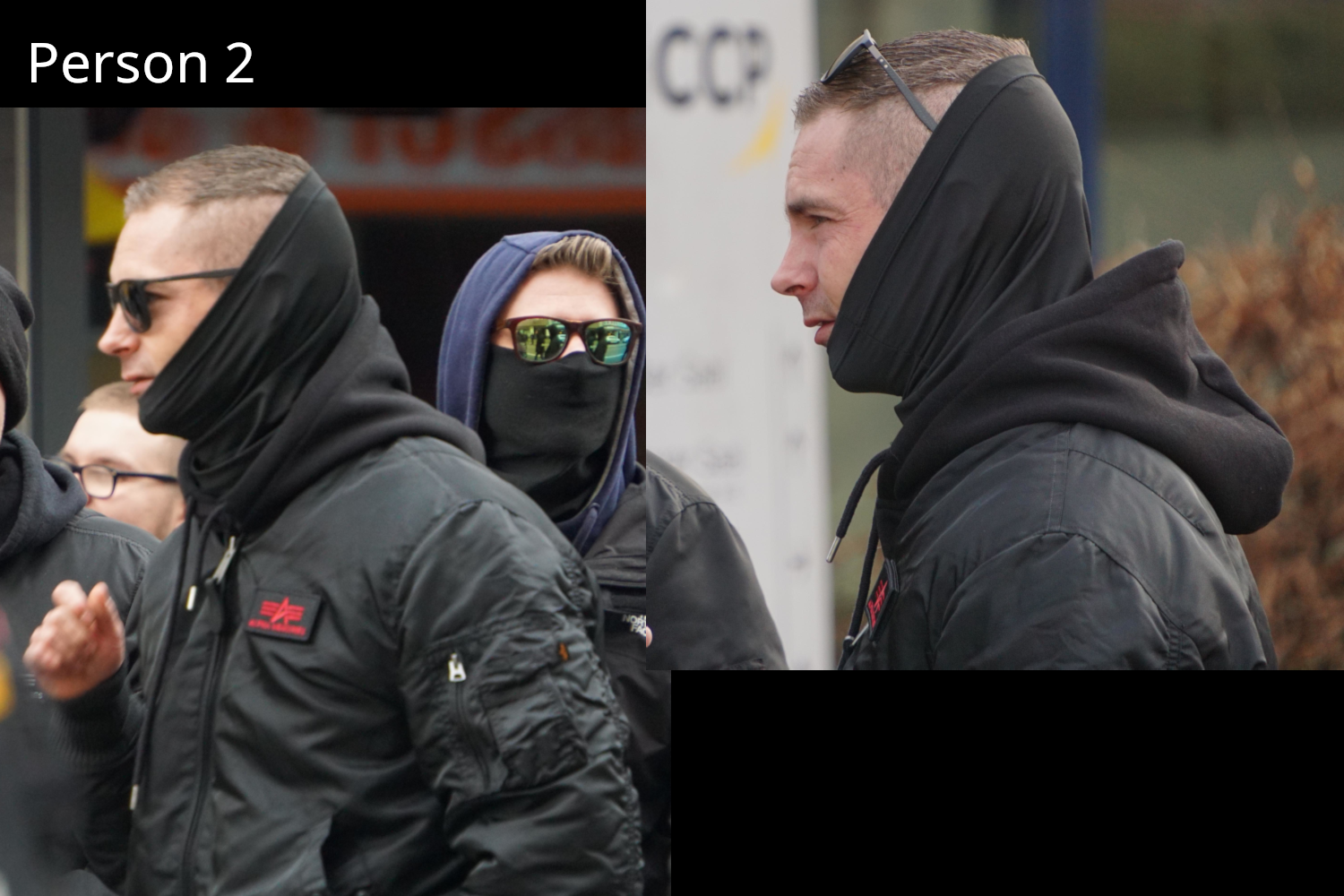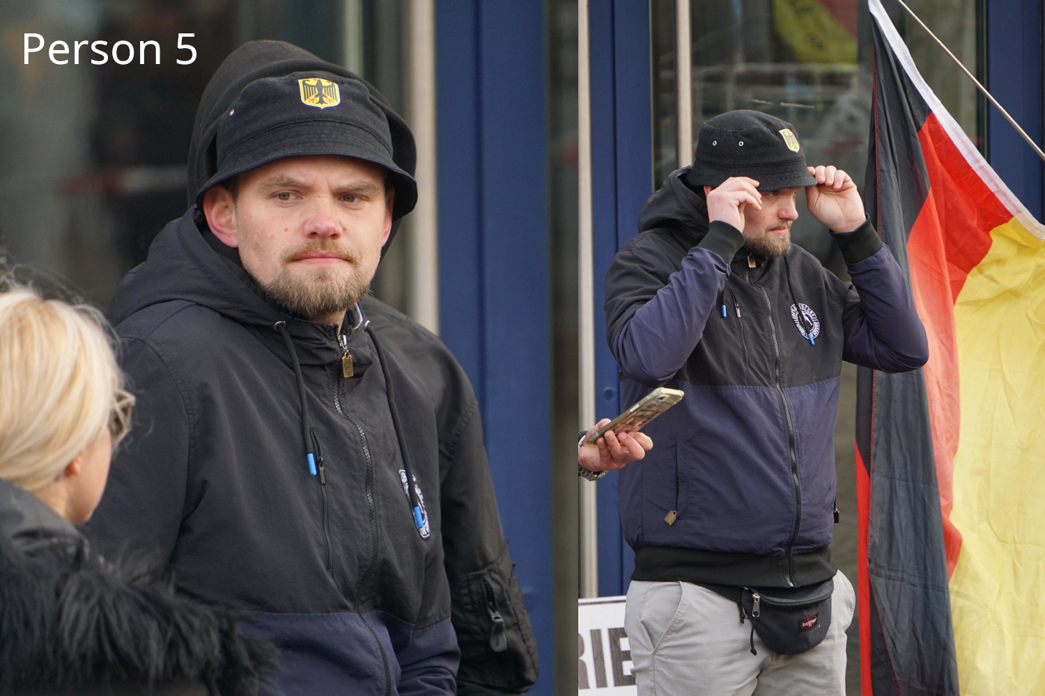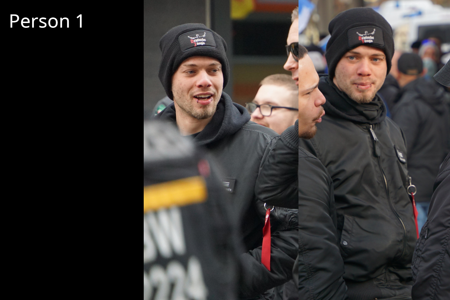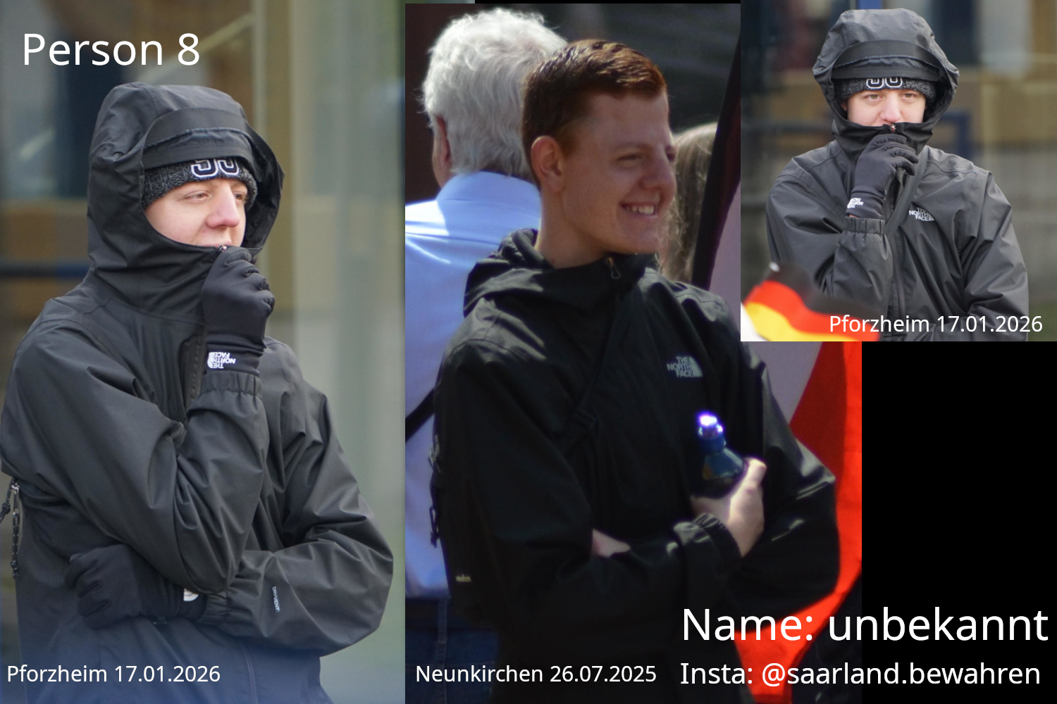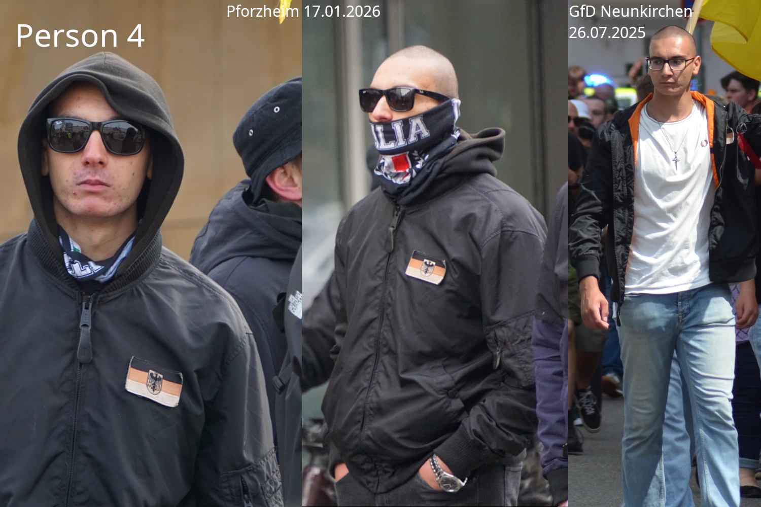 Person 4: Unbekannt, ebenfalls schon beim CSD und bei der GfD Veranstaltung in Neunkirchen anwesend (selbe Jacke mit DE-Fahnen-Patch). Unterwegs mit 5 und 8.
