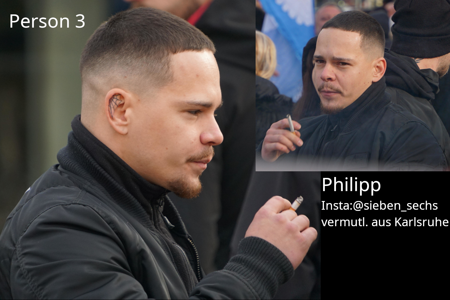 Person 3: Philip, auf Instagram @sieben_sechs, was vermutlich auf eine Postleitzahl schließen lässt (Großraum Karlsruhe). Gehörte zur C-60 Bruderschaft und war ebenfalls z.B. auf der CSD Gegenveranstaltung in Pforzheim im C-60 Shirt anwesend.