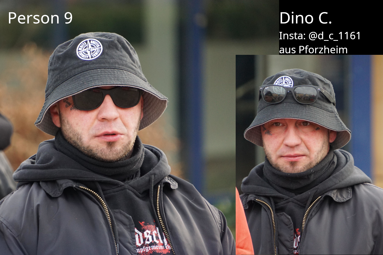 Person 9: Dino C. (Instagram: @d_c_1161). Der bekannte Pforzheimer Neonazi Dino C. war letztes Jahr eine zentrale Schlüsselfigur für den DST Süd, der zu Hochzeiten ca. 30 Personen mobilisieren konnte. Anschließend organisierte er die C60 Brotherhood, die für einige Monate aktiv war. Vor einigen Monaten löste sich diese Gruppe offenbar aufgrund innerer Konflikte um Dino C. auf. Am Samstag kam Dino geschlossen mit anderen zur Demo, aber ohne erkennbaren Gruppenbezug.