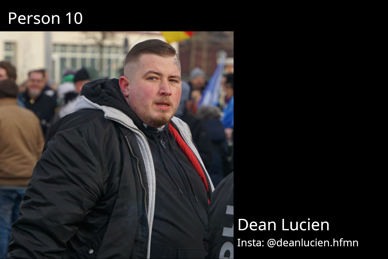 Person 10: “Dean Lucien”, auf Insta @deanlucien.hfmn. Nostril und sehr auffälliges Gesichtstattoo. Schien recht gut mit Tim (Person 11) und Dino C. Auf jeden Fall nicht aus Pforzheim.