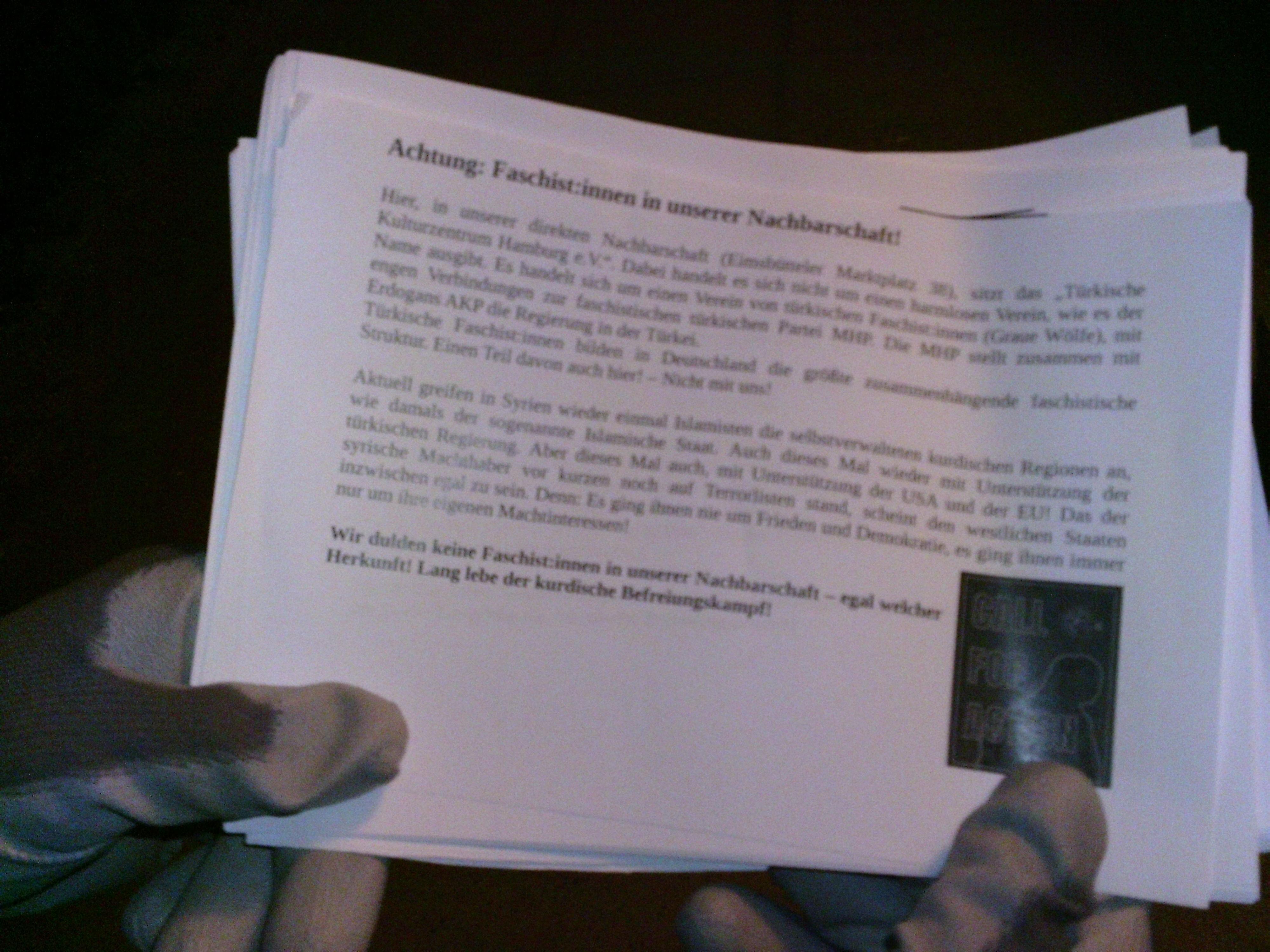 Hier, in unserer direkten Nachbarschaft (Eimsbütteler Marktplatz 38), sitzt das „Türkische KulturzentrumHamburg e.V.“. Dabei handelt es sich nicht um einen harmlosen Verein, wie es der Name ausgibt. Es handelt sich um einen Verein von türkischen Faschist:innen (Graue Wölfe), mit engen Verbindungen zur faschistischen türkischen Partei MHP. Die MHP stellt zusammen mit Erdogans AKP die Regierung in der Türkei.