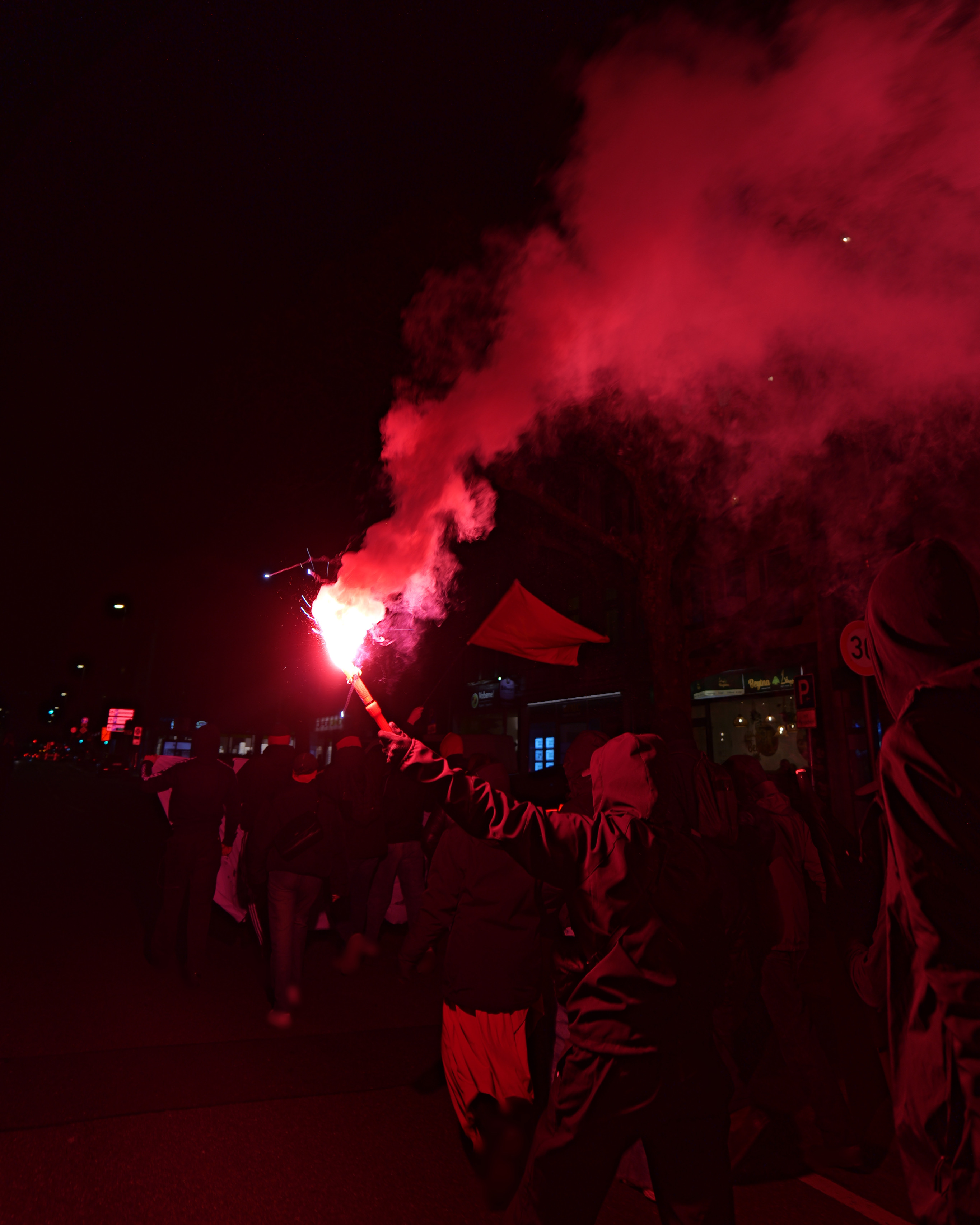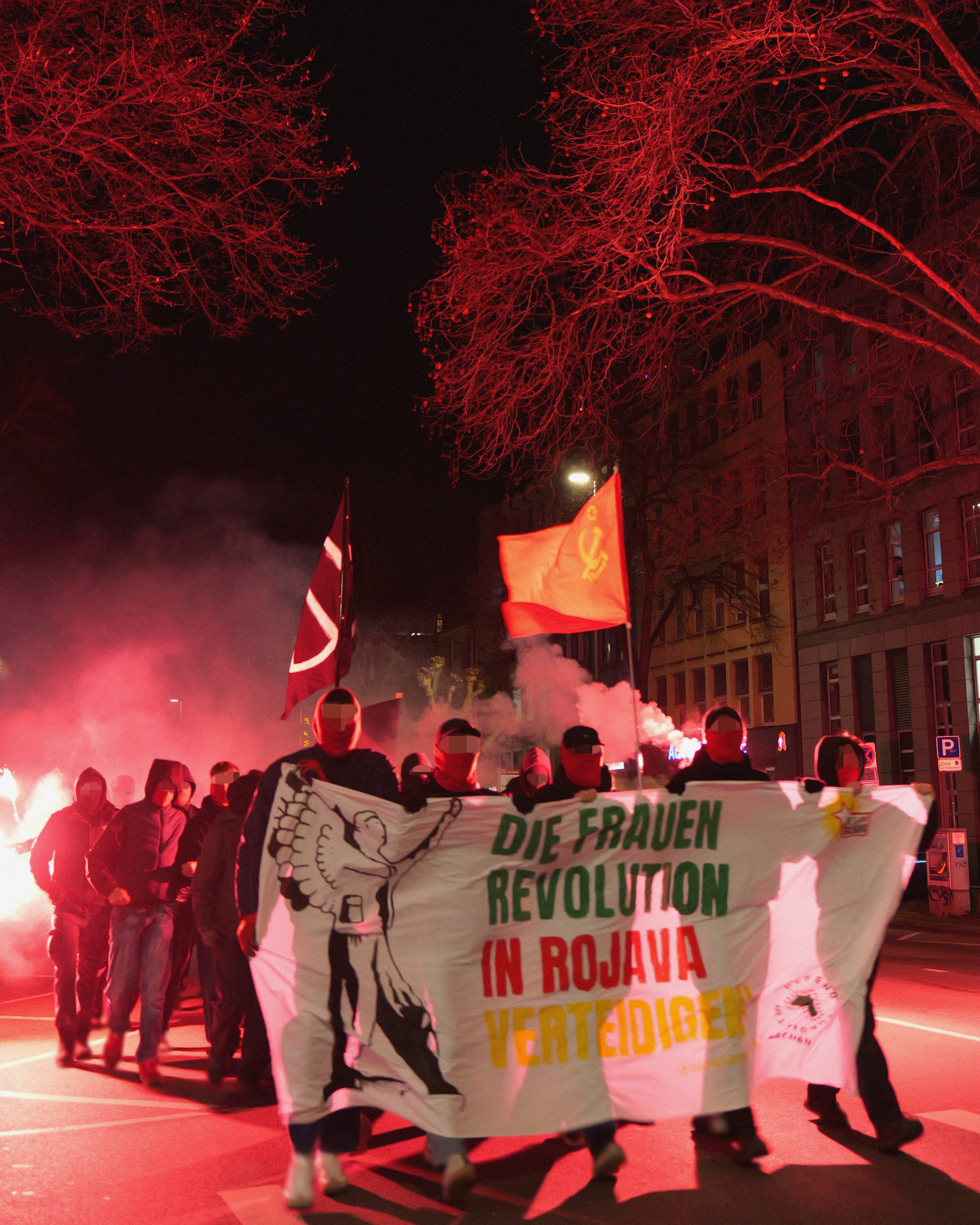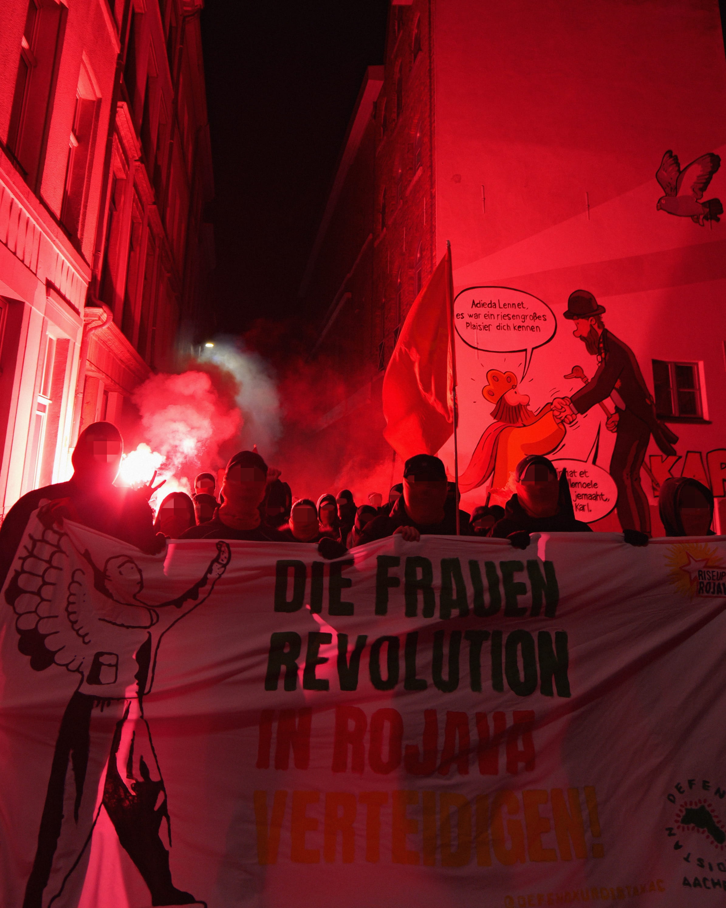 Im direkten Anschluss zu der angemeldeten Demonstration in Aachen am 23.01 mit über 1000 Menschen nahmen wir uns selbstbestimmt in der Innenstadt die Straße. Mit lauten Parolen und Pyrotechnik konnten wir kämpferisch für die Verteidigung der Frauenrevolution einstehen, obwohl die Polizei mit einem lächerlichen Großaufgebot versucht hat jede Militanz zu verhindern.