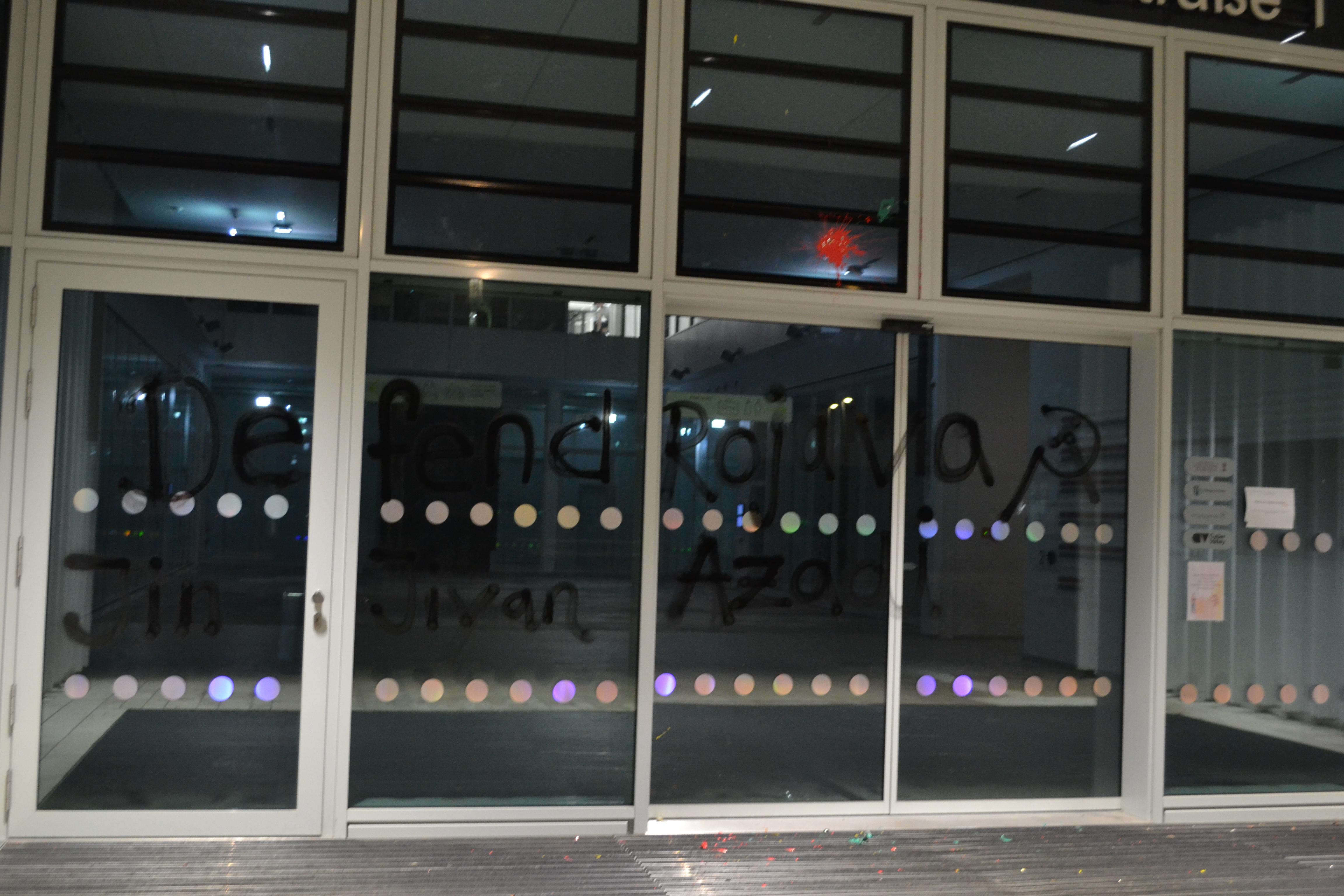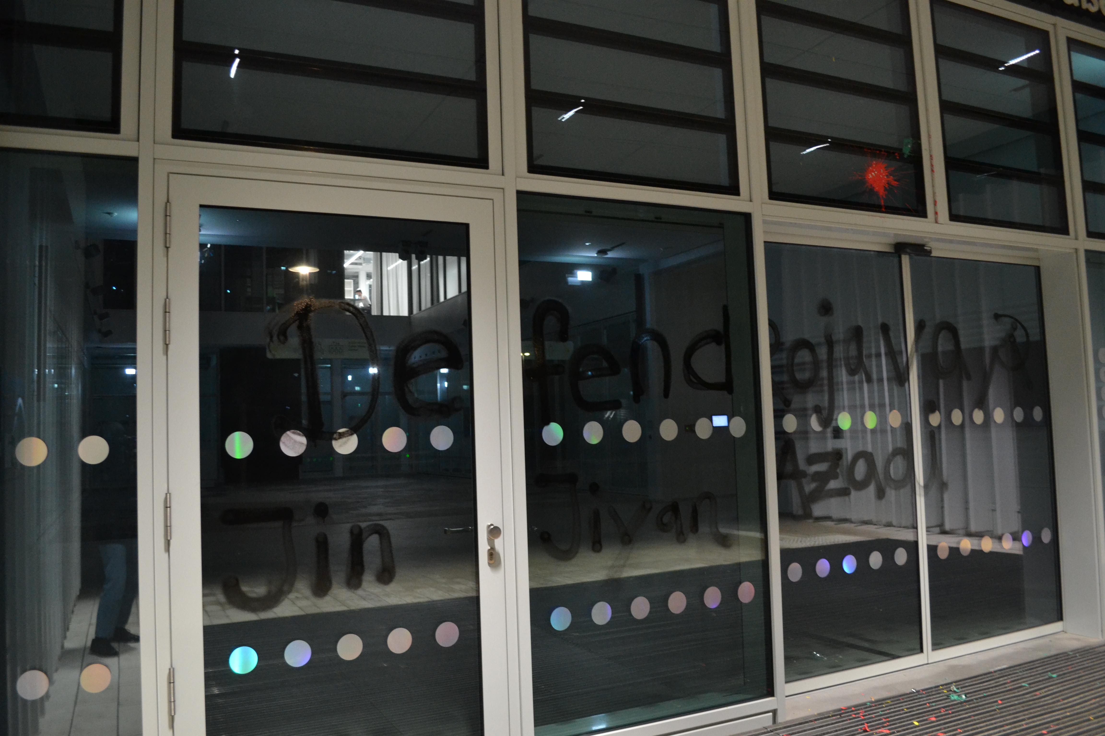 Defend Rojava – Farbe auf Hauptgebäude des Cyber Valley