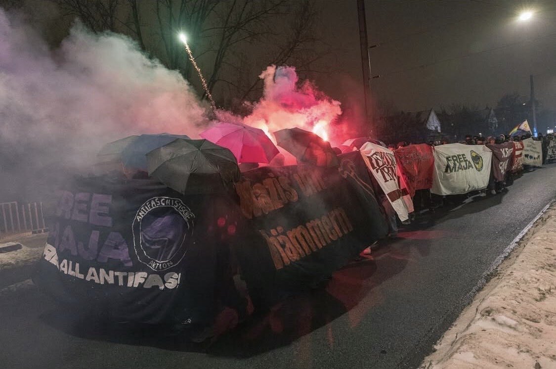 Am 4.2. versammelten sich an der Lutherkirche in der hannoverschen Nordstadt ca. 350 Personen um ihre Solidarität mit den in Budapest angeklagten AntifaschistInnen auszudrücken. Nach einer kurzen Auftaktkundgebung, setzte sich der Marsch in Bewegung. Am türkischen Konsulat vorbei, wo sich kurz mit viel Pyrotechnik und kurdischen Sprüchen mit der angegriffenen Revolution in Rojava solidarisiert wurde, ging es weiter in Richtung Linden. Im Viertel angekommen, wurde erneut zahlreiche Pyrotechnik und Feuerwerk gezündet, Menschen solidarisierten sich aus ihren Fenstern mit der Demonstration.