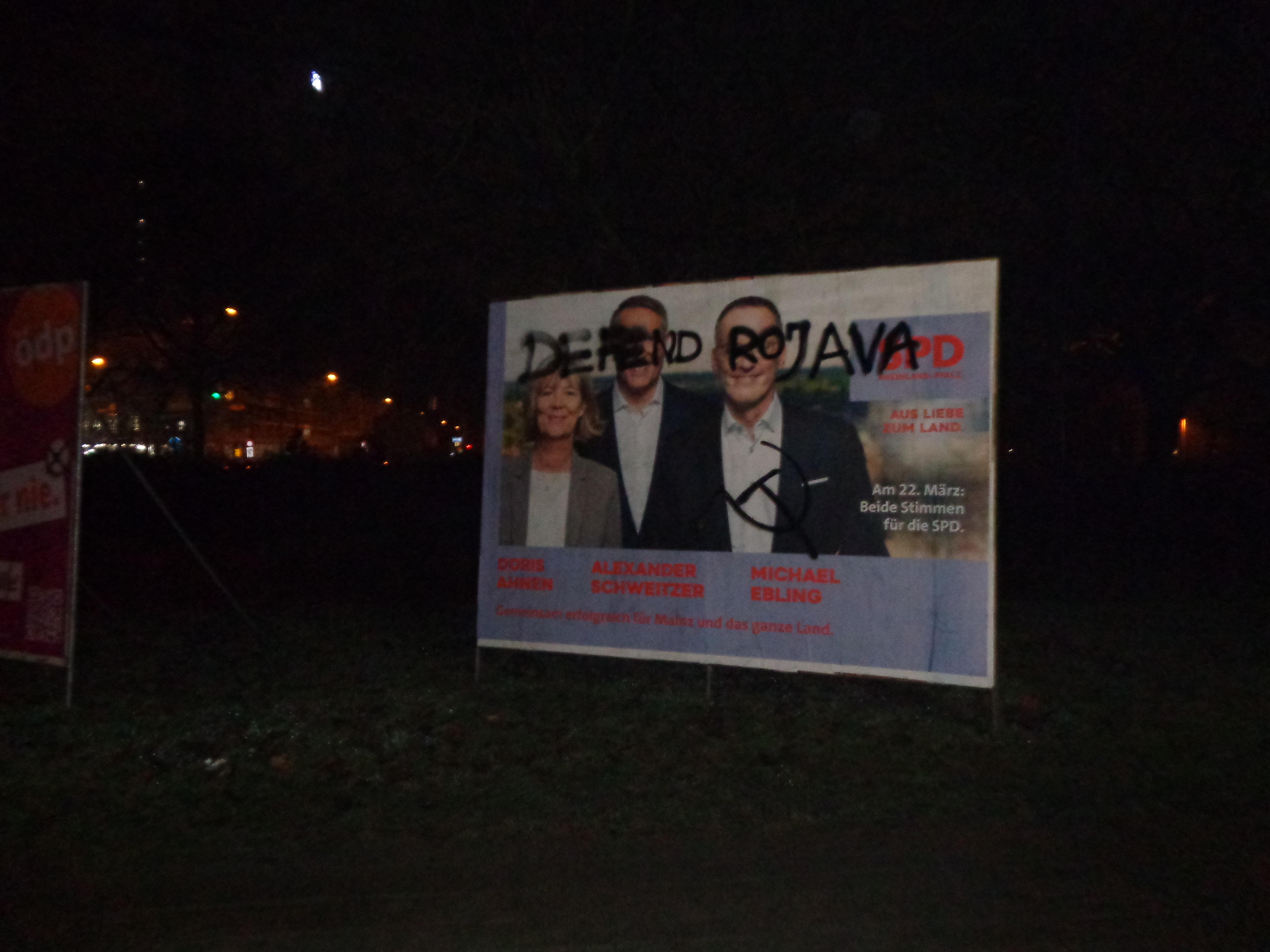 Auch Wahlplakate der Parteien waren dabei Ziel der Aktion, denn es ist die herrschende Politik die die Beteiligung an den Angriffen auf Rojava mitträgt, vielmehr fördert. Wir sagen ihnen, und ihrem System den Kampf an.