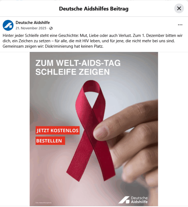 <figure id="attachment_510256" aria-describedby="caption-attachment-510256" style="width: 439px" class="wp-caption alignright"><img decoding="async" class="size-medium wp-image-510256" src="https://cdn.netzpolitik.org/wp-upload/2026/02/image001-439x484.png" alt="Eine Werbeanzeige auf Facebook mit einer einer Hand, die eine rote Schleife hält. Darauf der Schriftzug: Zum Welt-Aids-Tag Schleife zeigen"" width="439" height="484" srcset="https://cdn.netzpolitik.org/wp-upload/2026/02/image001-439x484.png 439w, https://cdn.netzpolitik.org/wp-upload/2026/02/image001-612x675.png 612w, https://cdn.netzpolitik.org/wp-upload/2026/02/image001.png 697w" sizes="(max-width: 439px) 100vw, 439px" /><figcaption id="caption-attachment-510256" class="wp-caption-text">Gesperrte Anzeige der Deutschen Aidshilfe. <span class='media-license-caption'> - Alle Rechte vorbehalten Screenshot: Facebook / Deutsche Aidshilfe</span></figcaption></figure>