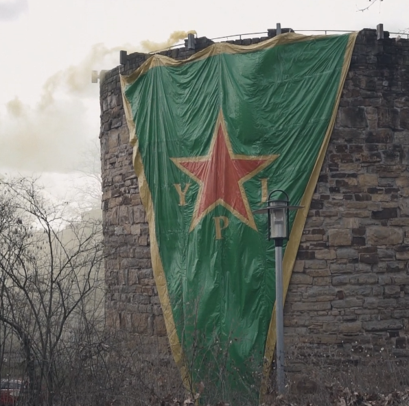 Solidarität mit Rojava - YPJ Fahne am Turm heruntergelassen