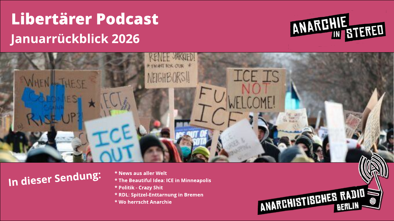 Das A-Radio Berlin präsentiert den neuen Libertären Podcast mit dem Januarrückblick 2026: unser ernster und satirischer Blick auf die Geschehnisse des Vormonats. Mit News aus aller Welt, einem übersetzten Bericht aus Minneapolis, unserer Politik-Satire, ein Interview von RDL zur Spitzelenttarnung in Bremen, Wo herrscht Anarchie, Musik u.v.m.