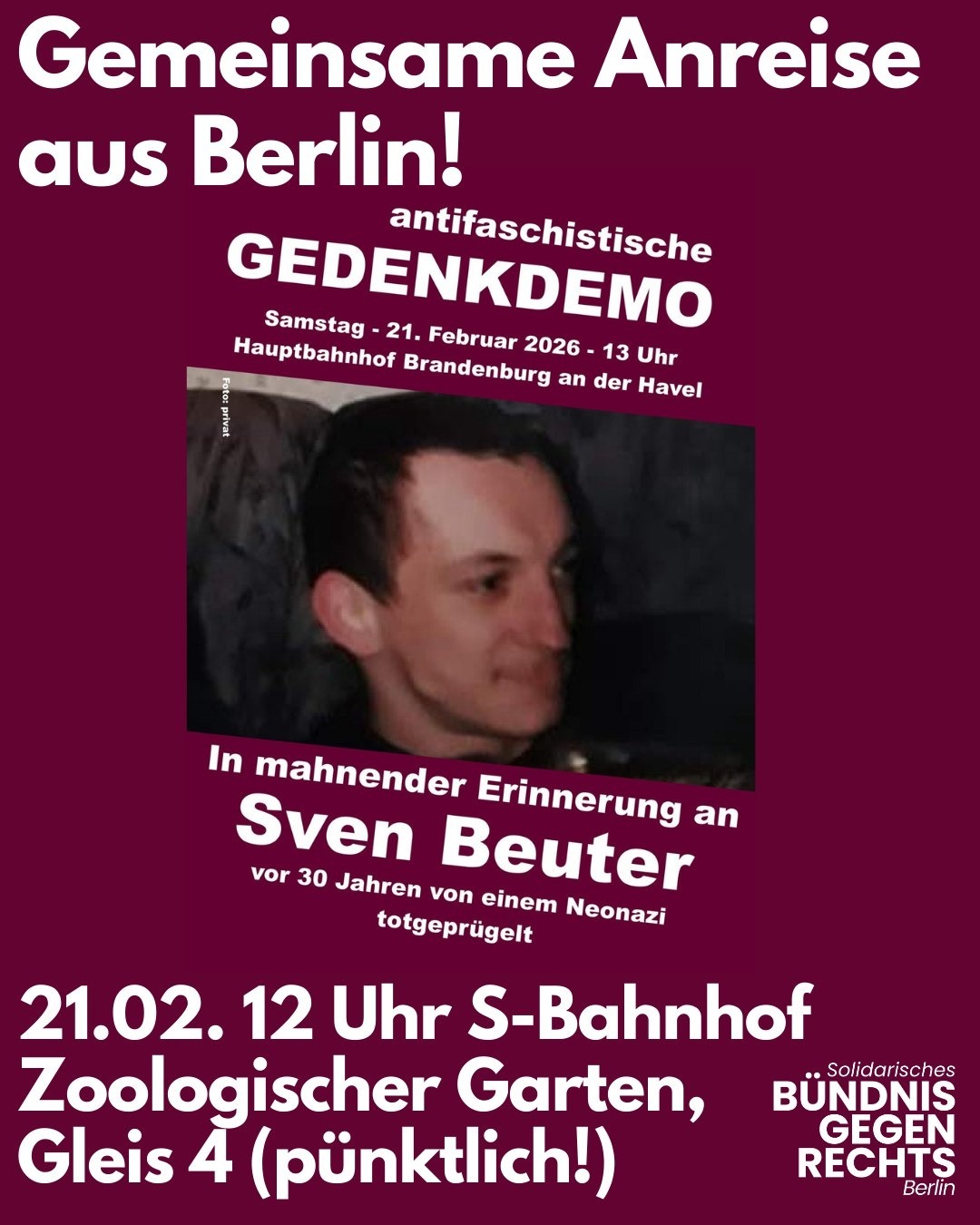 Gemeinsam wollen wir am Samstag, den 21. Februar, auf die Straße gehen, um an Sven Beuter zu erinnern, zu mahnen, wohin rechtes Gedankengut führt und um den Opfern rechter und neonazistischer Gewalt zu gedenken. Niemand ist vergessen! Bringt gerne Blumen mit.