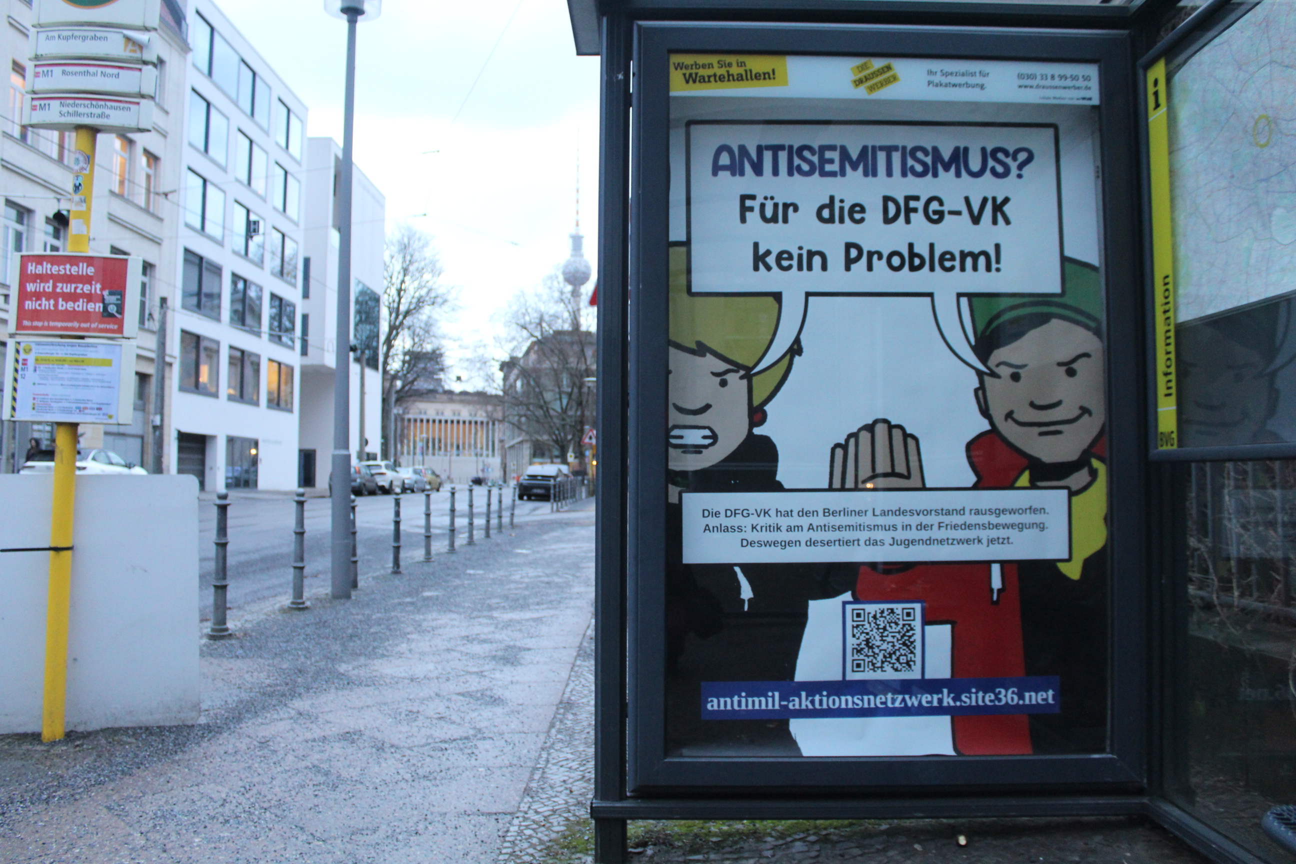 In Berlin, Stuttgart, Leipzig und Dresden kaperten die jungen Friedensaktivist*innen unerlaubt Werbevitrinen an Bushaltestellen. Diese lassen sich mit handelsüblichen Rohrsteckschlüsseln aus dem Baumarkt leicht öffnen, ohne etwas zu beschädigen oder zu entwenden. In den so gekaperten Werbevitrinen platzierten sie über 40 selbstgedruckte Plakate. Das Design der Plakate erinnert stark an einen bekannten Sticker der DFG-VK. Es zeigt zwei Figuren im Comicstil. Diese sagen „Antisemitismus? Für die DFG VK kein Problem!" Darunter steht: "Die DFG-VK hat den Berliner Landesverband rausgeworfen. Anlass: Kritik am Antisemitismus in der Friedensbewegung. Deswegen desertiert das Jugendnetzwerk jetzt." Ihre ausführlichen Gründe erläutern die jungen Aktiven in Interviews auf ihrem neuen Blog: