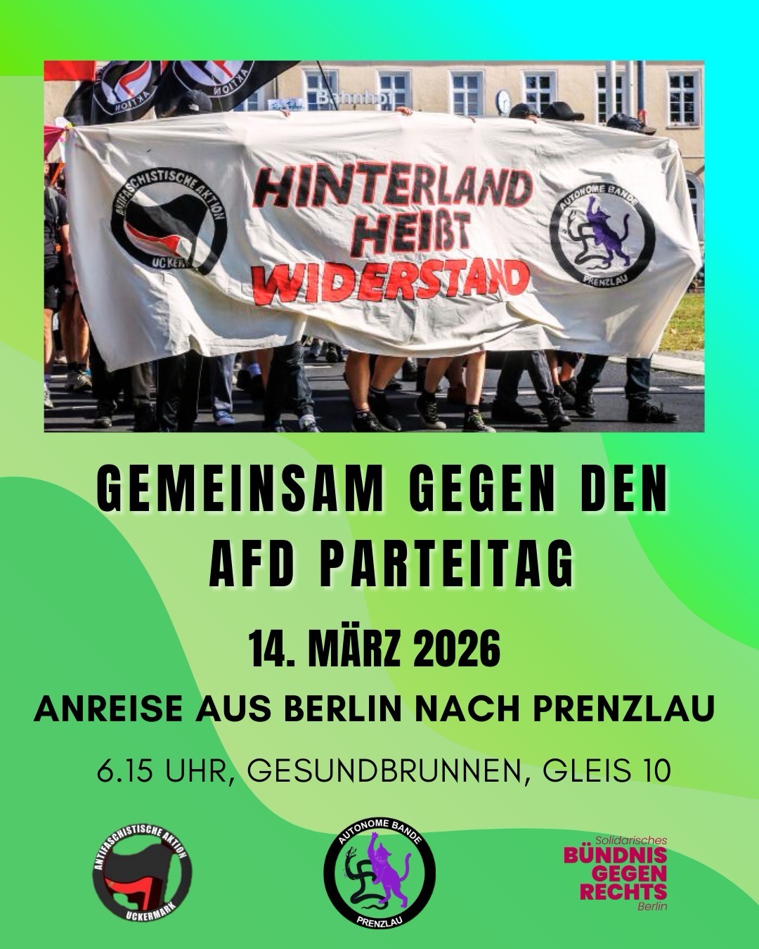 Die Brandenburger AfD trifft sich am 14./15. März, mit rund 500 erwarteten Leuten in Prenzlau für ihren Parteitag. Zur Verfügung gestellt wurde die städtische Uckerseehalle. Wir werden ab 8 Uhr an der Halle mit mehreren Kundgebungen und einer Demo vom Bahnhof Prenzlau aus demonstrieren.