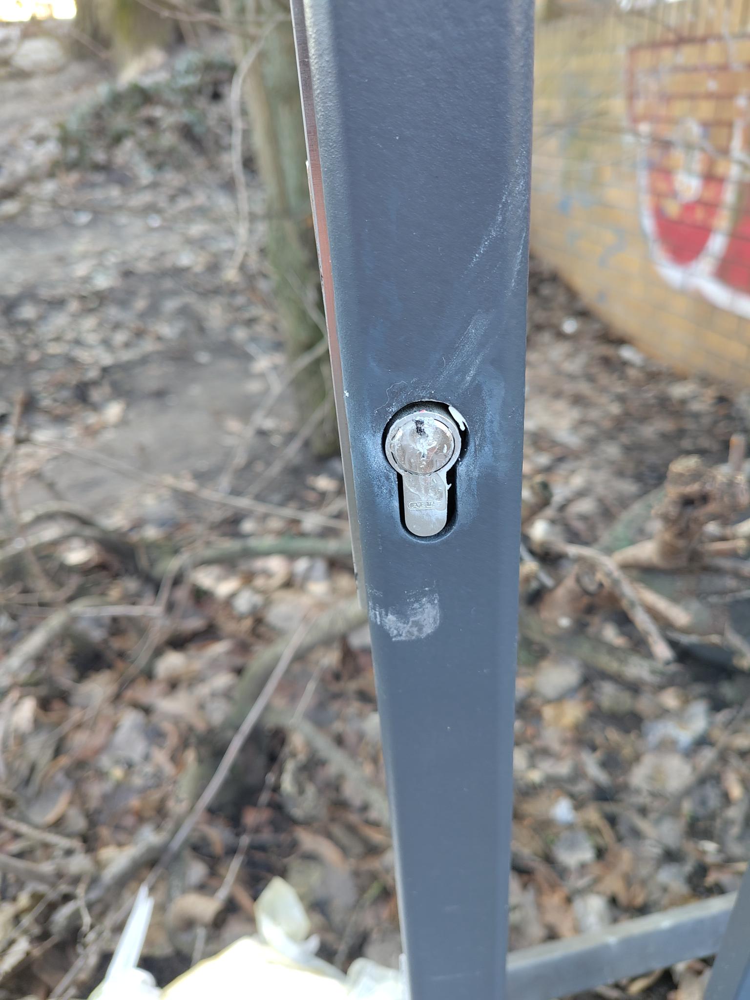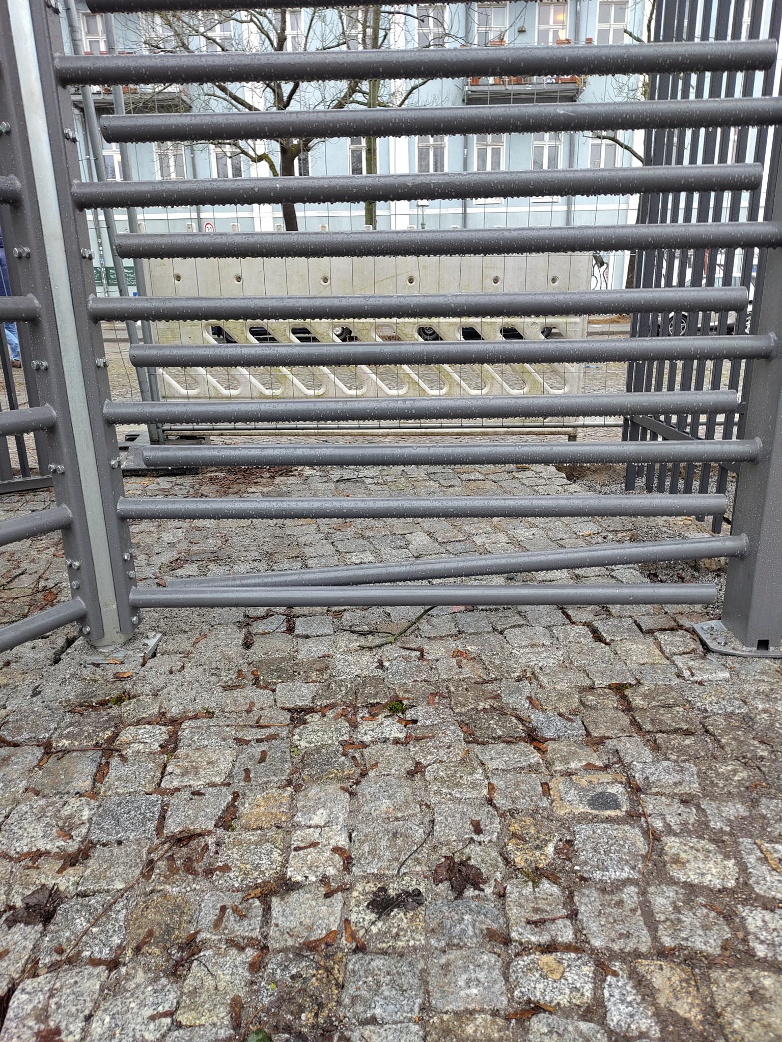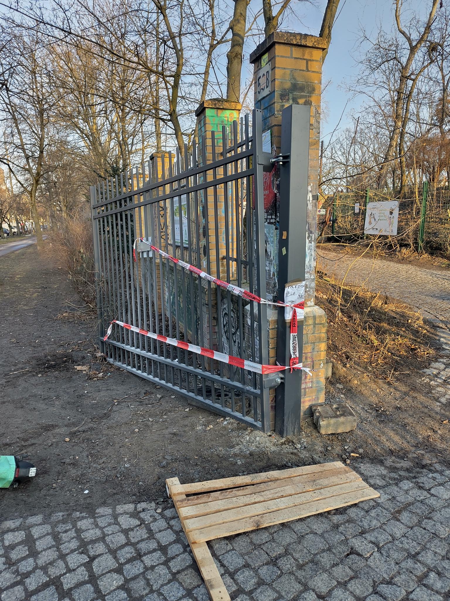 Millionenteure Einsätze von privater Security und Cops in Uniform und zivil sind offenbar nicht genug. Heute konnten wieder diverse Beschädigungen an den teuren Görli-Sperranlagen beobachtet werden, darunter u.a. anscheinend zugeklebte Schlösser (die wohl direkt ausgewechselt wurden), ein recht derb außer Form geratenes Drehkreuz und ein nur noch fragil an den Angeln hängenden Tor.