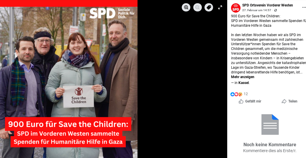 Besonders deutlich wurde diese Heuchelei am 27. Februar 2026, als am Wahlkampfstand ders SPD Kassel im vorderen Westen öffentlichkeitswirksam Spenden „für die Kinder in Gaza“ gesammelt wurden – flankiert von Wahlplakaten, Parteilogos und für Social Media. Leid wird hier zur Kulisse, Mitgefühl zur Wahlkampfstrategie. Wer humanitäre Hilfe ernst meint, stellt sie nicht zwischen Luftballons, Give-aways und Parolen und grinst danach in die Kamera für Instagram.