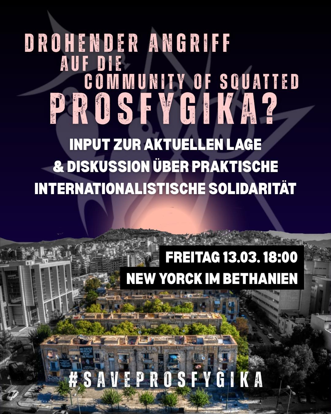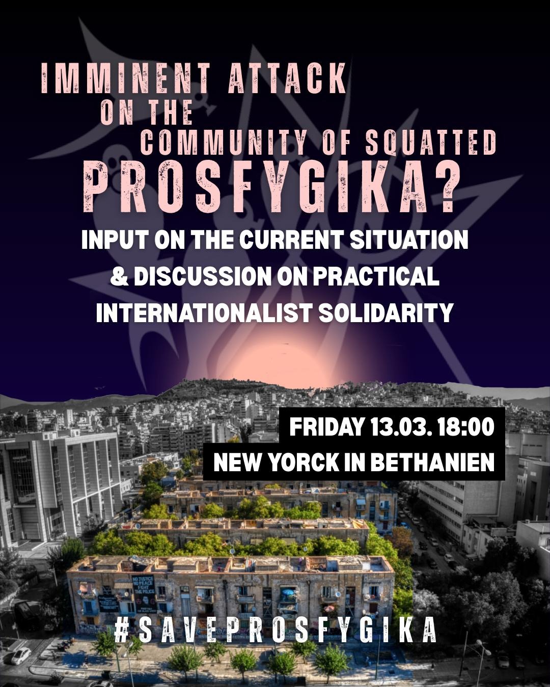Die Community of Squatted Prosfygika hat beschlossen, ihren gesellschaftlichen Vorschlag, ihre Menschen, ihre Strukturen und ihre gemeinsame Geschichte bis zum Ende zu verteidigen. Sie ist bereit dies auf allen Ebenen zu tun – und damit für ihre eigene Existenz und Befreiung zu kämpfen. In diesem Sinne rufen wir dazu auf zusammenzukommen. Wir werden über die aktuelle Lage informieren und uns darüber austauschen wie wir als Internationalist*innen die Verteidigung Prosfygikas unterstützen können.