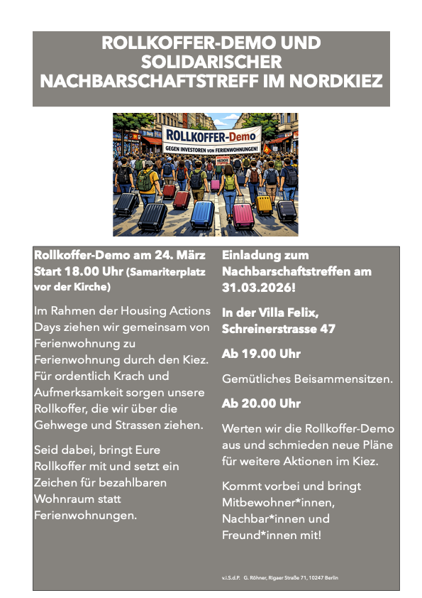 Seid dabei, bringt Eure Rollkoffer mit und setzt ein Zeichen für bezahlbaren Wohnraum statt Ferienwohnungen