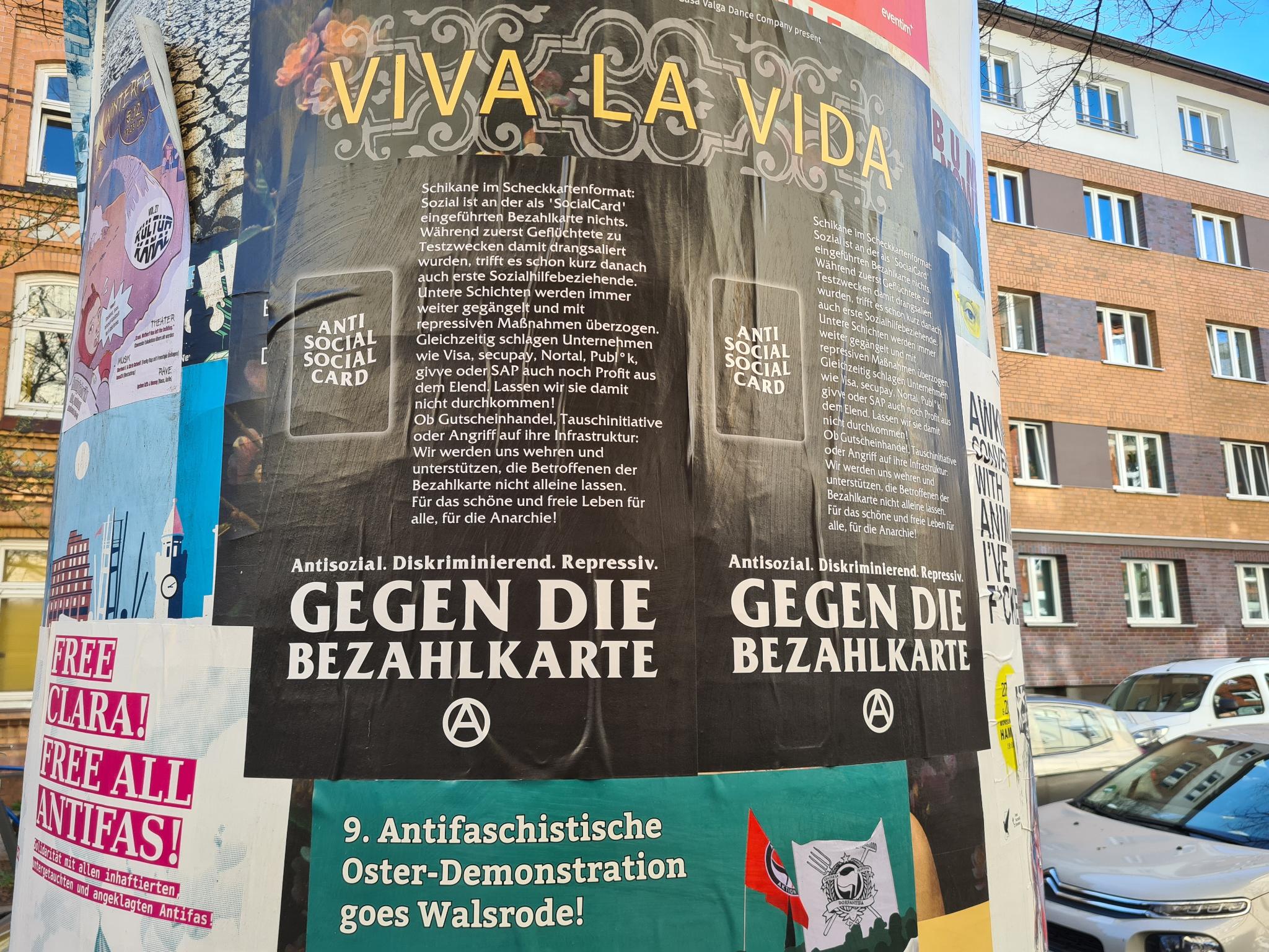 Schikane im Scheckkartenformat: Sozial ist an der als 'SocialCard' eingeführten Bezahlkarte nichts. Während zuerst Geflüchtete zu Testzwecken damit drangsaliert wurden, trifft es schon kurz danach auch erste Sozialhilfebeziehende. Untere Schichten werden immer weiter gegängelt und mit repressiven Maßnahmen überzogen. Gleichzeitig schlagen Unternehmen wie Visa, secupay, Nortal, Publ°k, givve oder SAP auch noch Profit aus dem Elend. Lassen wir sie damit nicht durchkommen! Ob Gutscheinhandel, Tauschinitiative oder Angriff auf ihre Infrastruktur: Wir werden uns wehren und unterstützen, die Betroffenen der Bezahlkarte nicht alleine lassen. Für das schöne und freie Leben für alle, für die Anarchie!